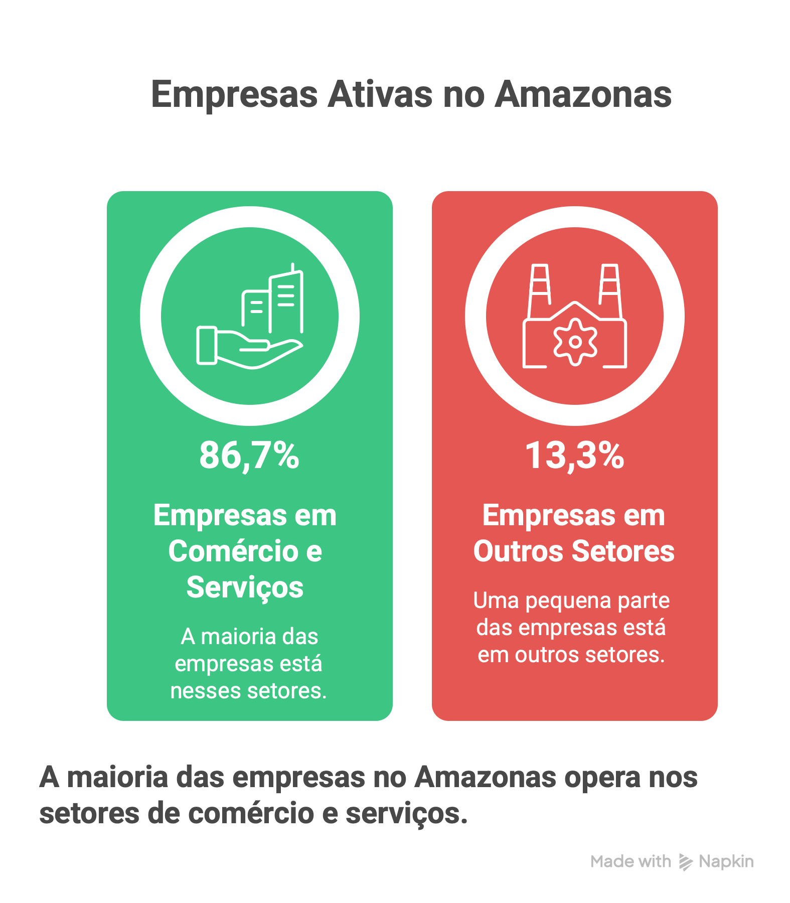 Dentro desse universo, o dado mais expressivo é a força de dois setores que seguem sustentando a dinâmica econômica amazonense: comércio e serviços concentram 86,7% das empresas ativas, consolidando-se como protagonistas do mercado local.