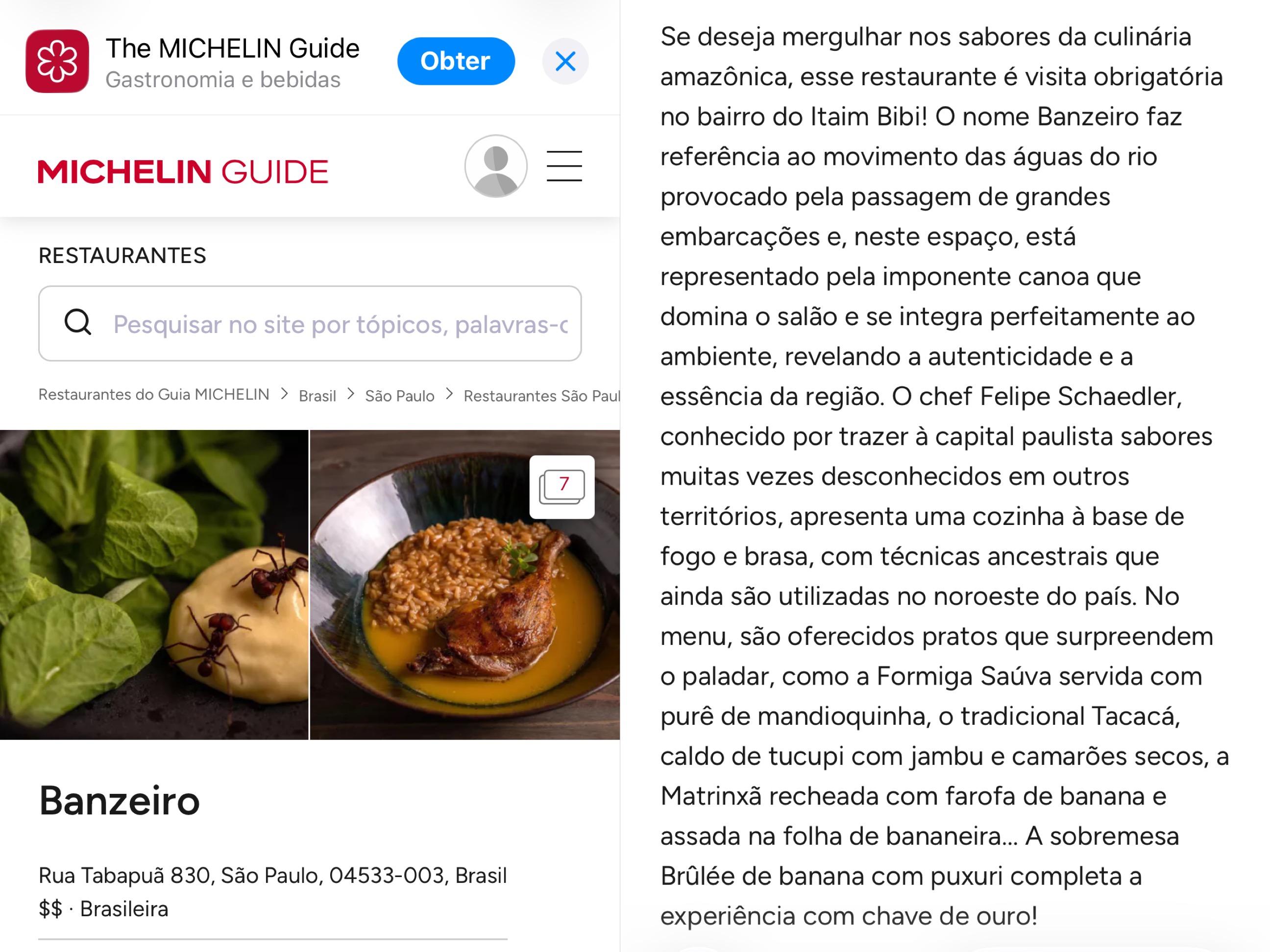 O texto dos inspetores descreve o restaurante como visita obrigatória no Itaim Bibi para quem deseja mergulhar nos sabores amazônicos, e destaca a cozinha à base de fogo e brasa com técnicas ancestrais ainda utilizadas no norte do país.