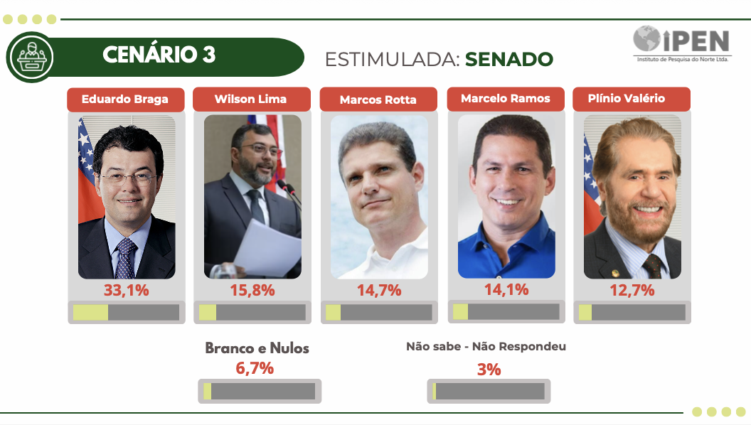 No cenário sem o governador Wilson Lima, Eduardo Braga sobe ainda mais nas pesquisas. Ele chega a 32,5%; é seguido por Alberto Neto, que herda alguns pontos e aparece com 22,5%; Marcelo Ramos chega ao terceiro posto, com 13,8%; Marcos Rotta aparece com 11,7% e Plínio Valério, 11,6%.