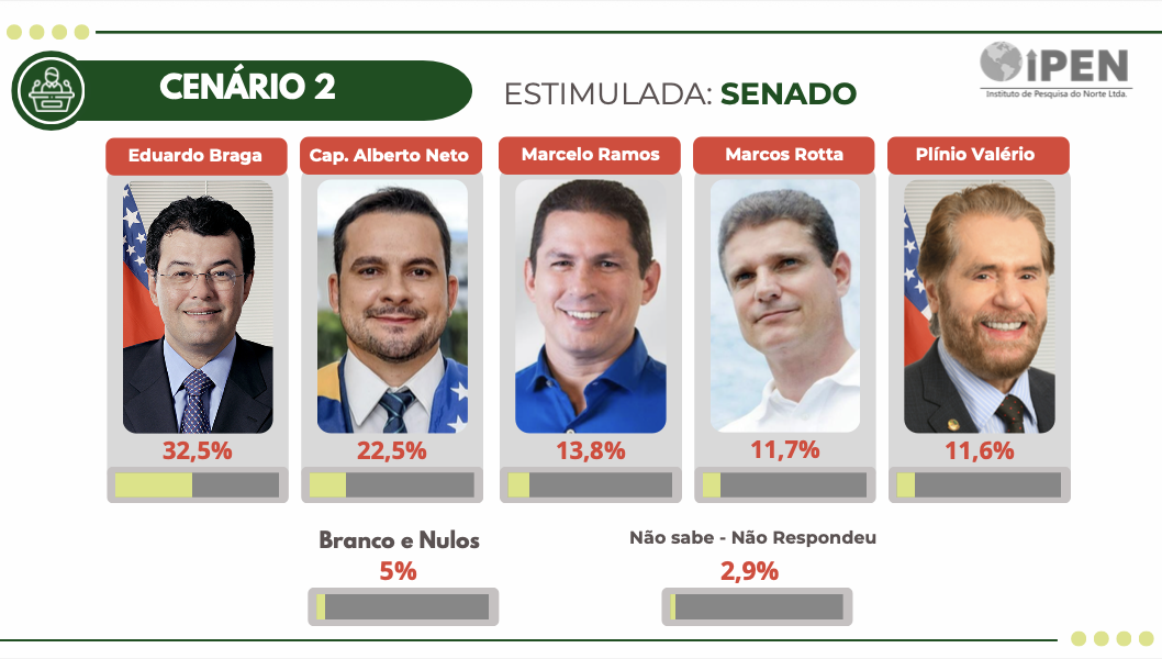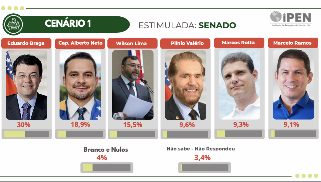 A nova pesquisa do Instituto de Pesquisa do Norte (IPEN), contratada pelo Consórcio G6, mostra um cenário cada vez mais confortável para o senador Eduardo Braga (MDB), que aparece isolado na liderança em todos os cenários estimulados para o Senado.