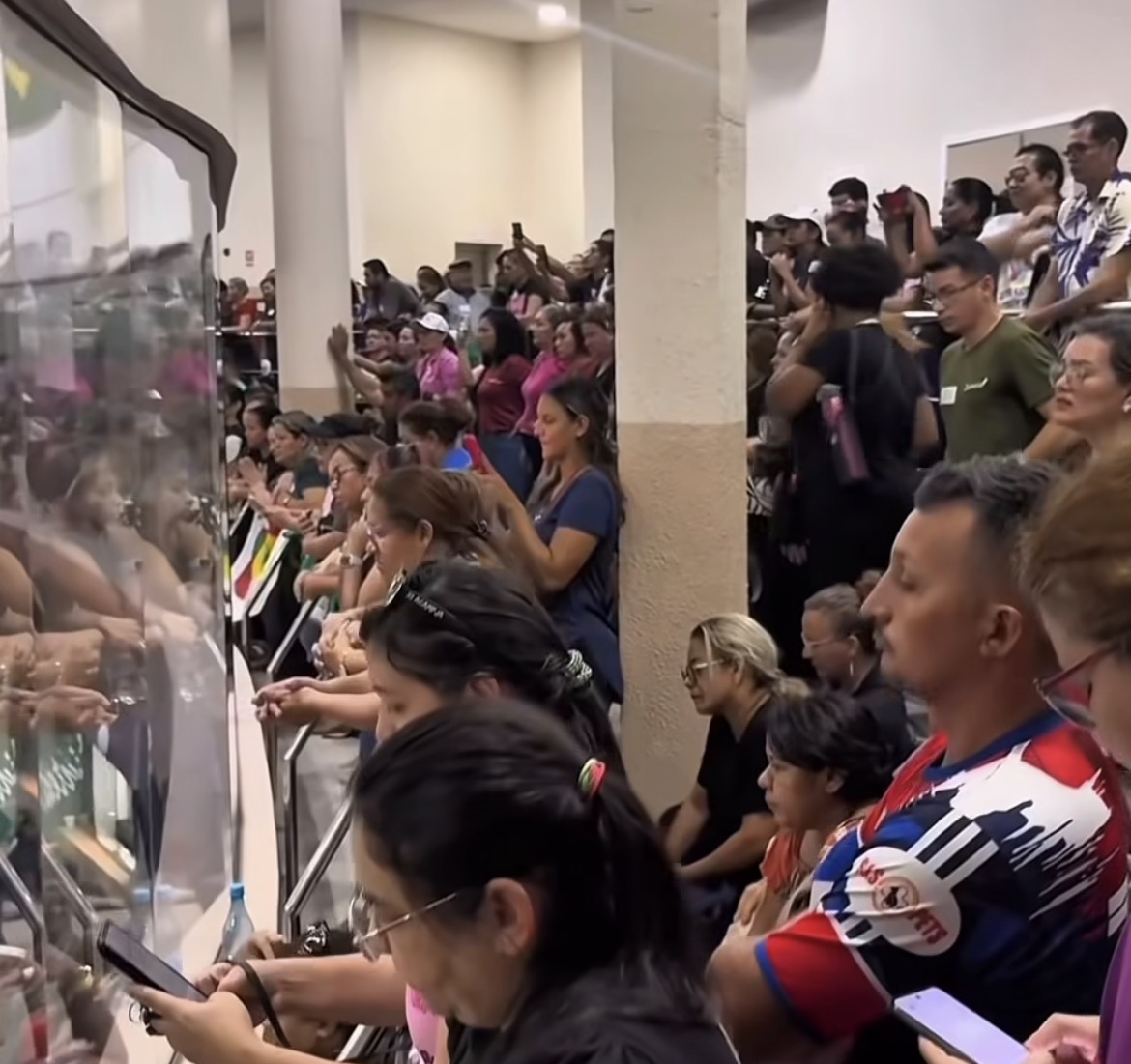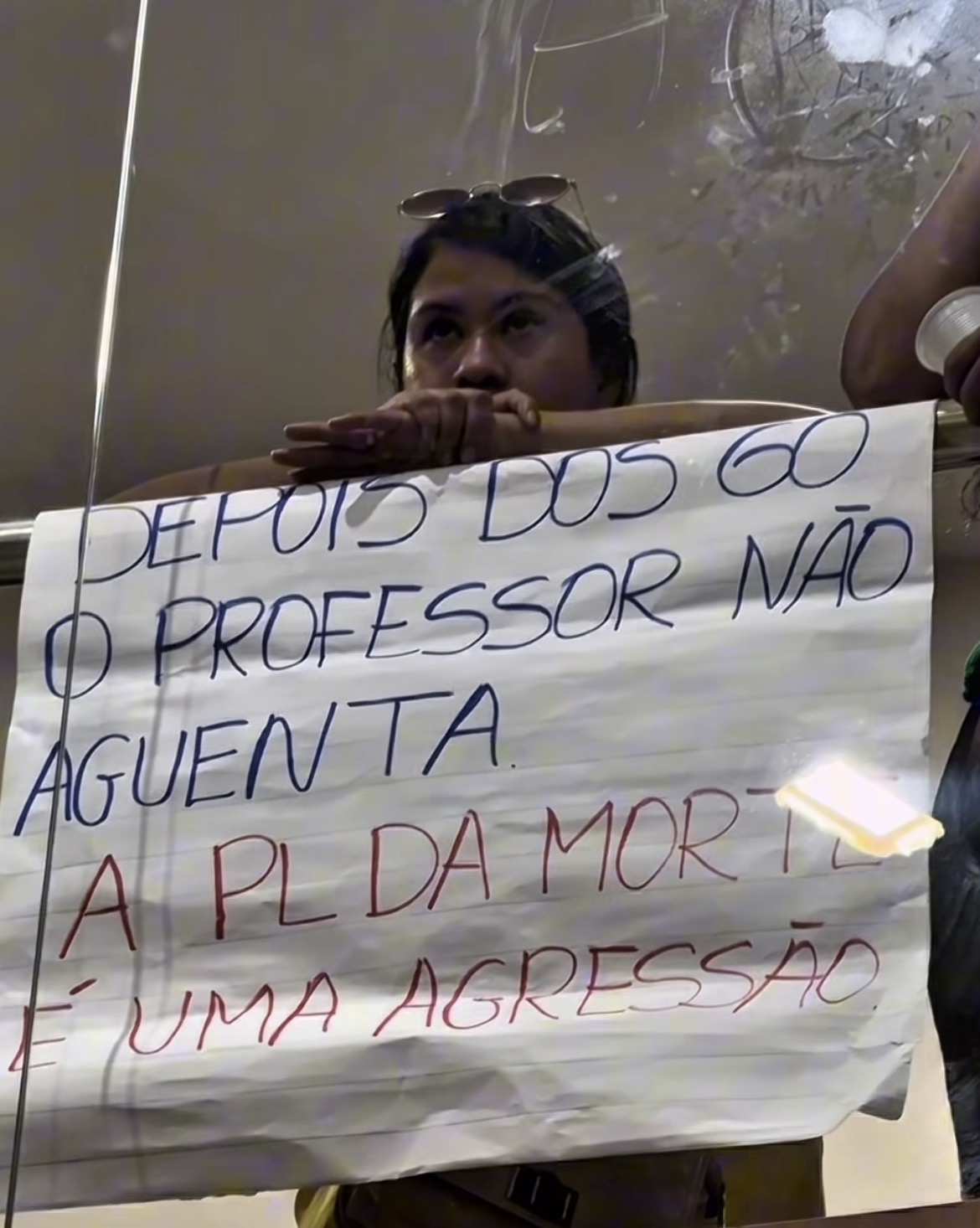 Nas galerias, professores protestaram pedindo a rejeição do PLC 008/2025, apelidando-o de “PL da morte”. A categoria critica especialmente o aumento da idade mínima para aposentadoria: sete anos a mais para mulheres e cinco para homens. Para professores, as novas regras elevam a idade para 57 anos (mulheres) e 60 anos (homens).