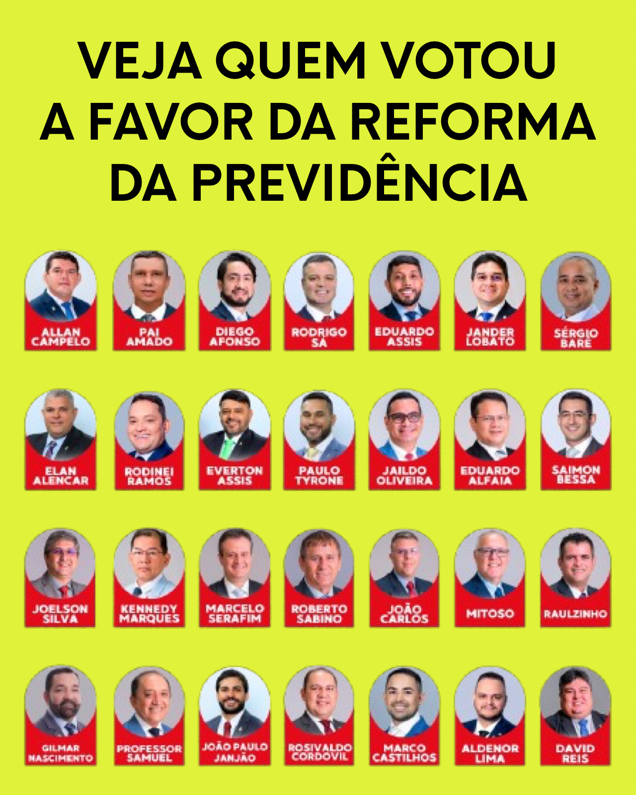 Votaram contra a reforma: Rodrigo Guedes, Ivo Neto, José Ricardo, Eurico Tavares, Amauri Gomes, Coronel Rosses, Sargento Salazar, Capitão Carpê, Raiff Matos e Thaysa Lippy.