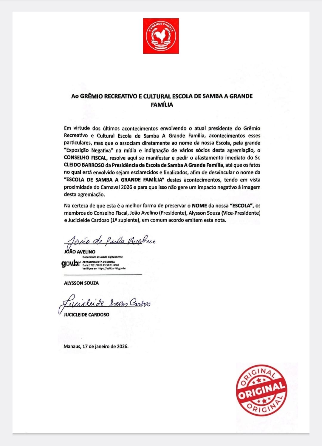 O Conselho Fiscal do Grêmio Recreativo e Cultural Escola de Samba A Grande Família solicitou oficialmente o afastamento imediato do presidente da agremiação, Cleildo Barroso, em meio à repercussão negativa de fatos recentes que passaram a associar o nome da escola a episódios alheios às suas atividades institucionais.