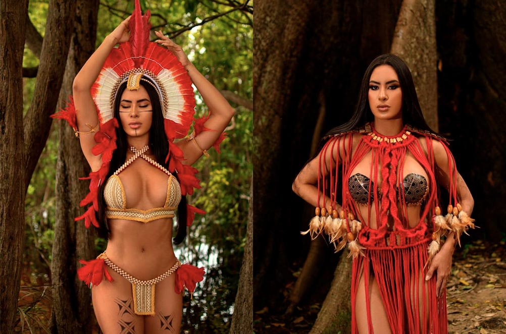 A mulher mais bonita da aldeia vermelha usou três produções. A primeira indumentária foi confeccionada pelo artista Estevão Gomes, na cor branca. A roupa confeccionada em couro sintético tem inspiração em grafismos indígenas da Amazônia, com uma pegada “tribal-punk”. Na visão do artista, é um jeito moderno e contemporâneo de levar as artes tribais para o mundo urbano.