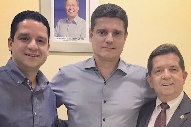 O deputado estadual Wanderley Dallas esteve na entrevista coletiva do prefeito Arthur Neto sobre a reforma administrativa do Executivo Municipal. Ao final do ato, ele postou uma foto com o filho, Dallas Filho, alçado ao cargo de vereador com a ida de Marcel Alexandre para a Superintendência Municipal de Transportes Urbanos (SMTU).