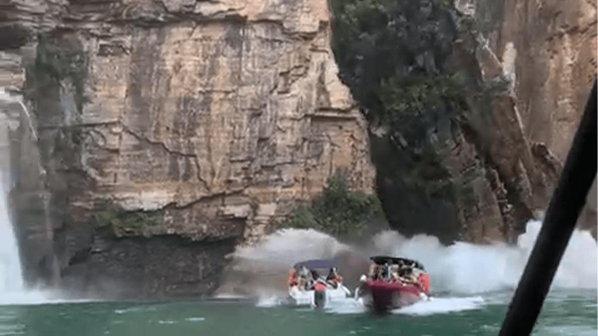 Imagens compartilhadas nas redes sociais mostram o momento que o cânion desaba. Os pilotos das lanchas aceleram para fugir, mas a princípio não conseguem e são atingidos.