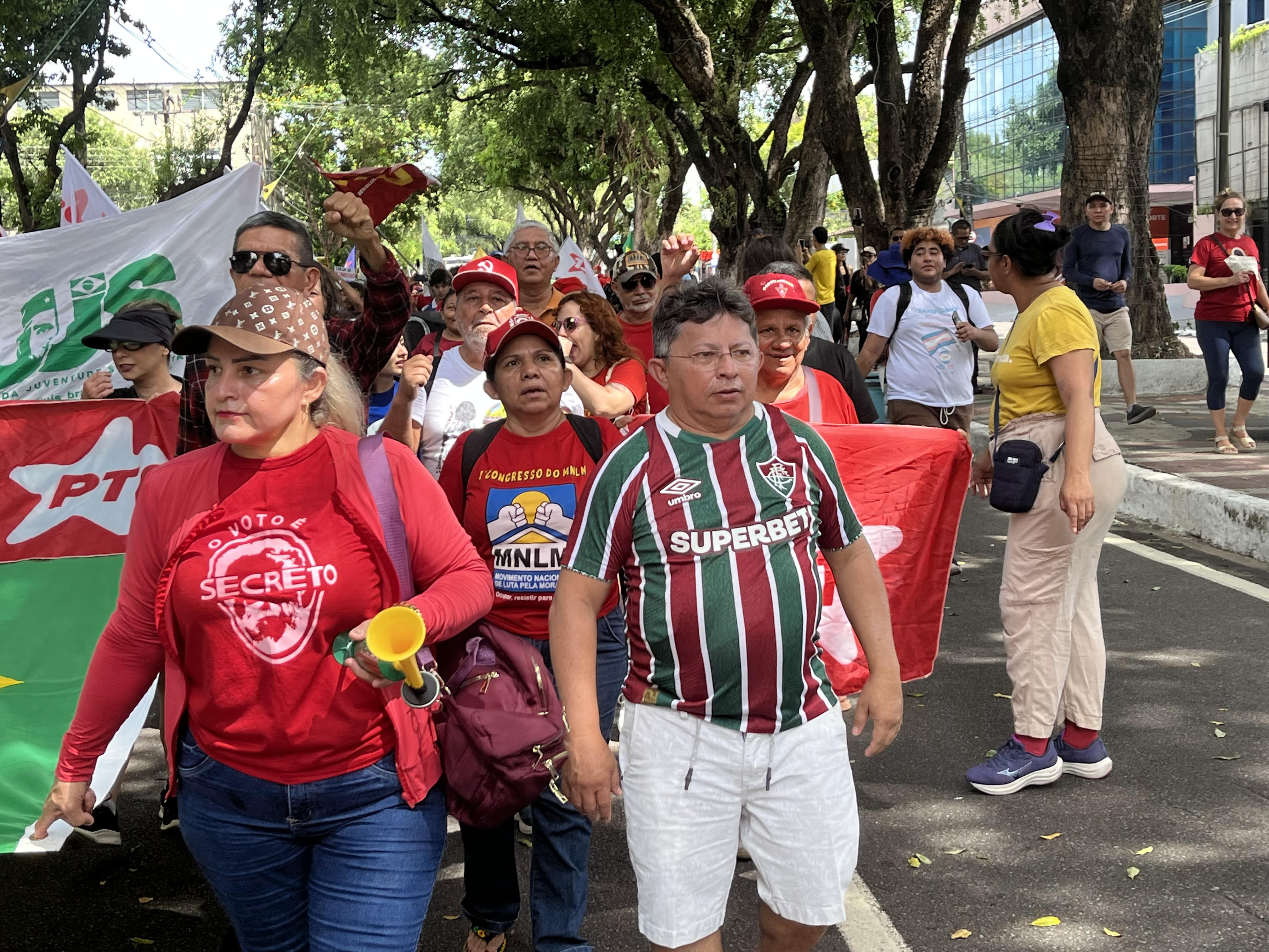 Enquanto a maioria de militantes vestiam a camisa vermelha do PT, Psol ou do PcdoB, Sinésio apareceu na manifestação vestido com uma camisa do Fluminense.