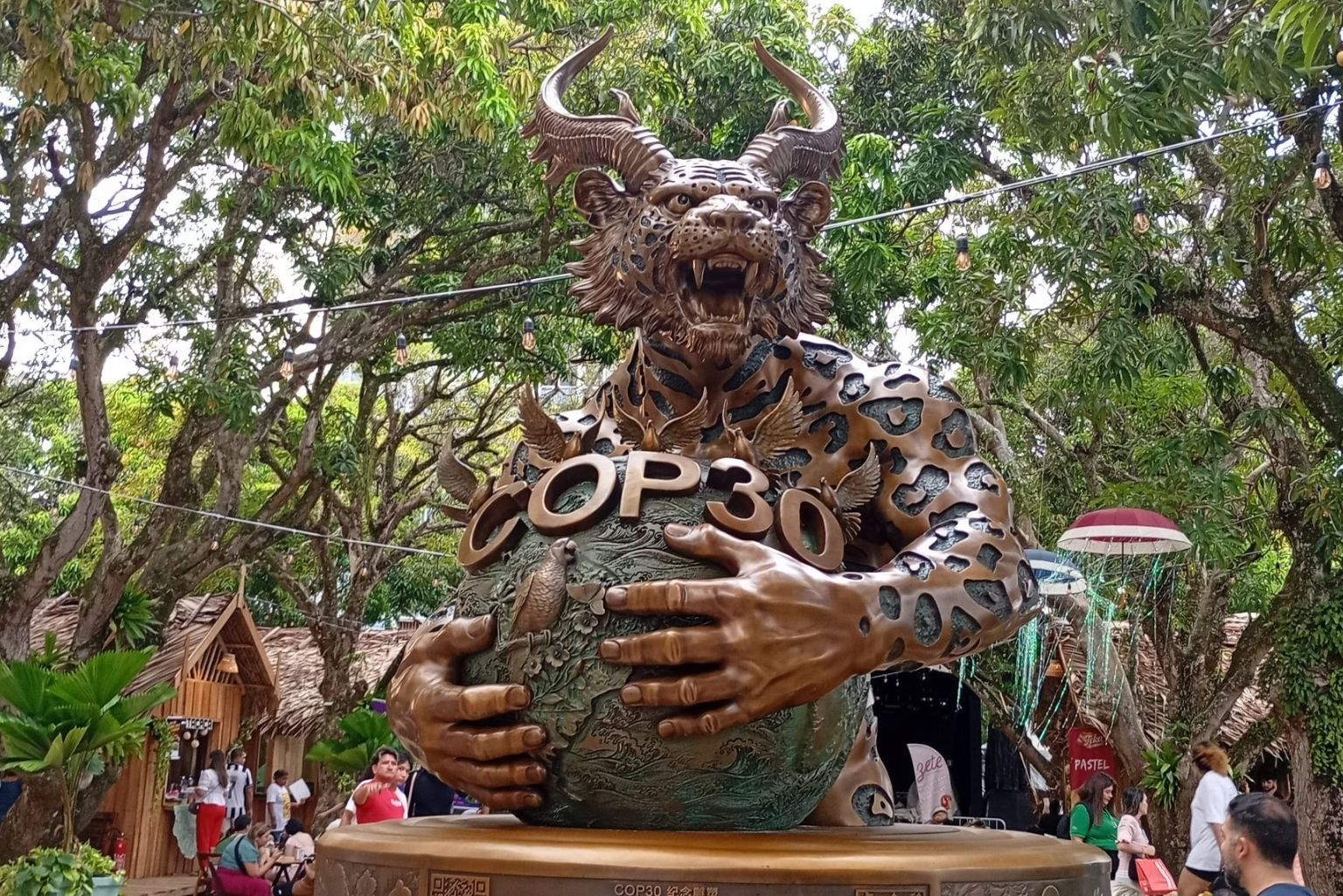 A obra Espírito Guardião Dragão Onça foi dada pela China. Trata-se de uma criatura com chifres e dentes pontudos, abraçando um globo terrestre em que está escrito COP30. eita pela artista Huang Jian, a obra é uma mistura de dragão (simbolizando a China) e onça-pintada (simbolizando o Brasil). O dragão onça é um guardião da floresta tropical.