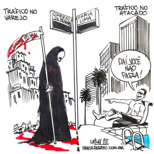 Uma megaoperação realizada pelo Ministério Público de São Paulo (MPSP) em agosto deste ano mirou um esquema de fraudes no setor de combustíveis com participação de integrantes do PCC (Primeiro Comando da Capital). Diversos mandados foram cumpridos na Avenida Faria Lima, principal centro financeiro do país. O PCC usava instituições financeiras, incluindo fintechs e fundos de investimento, como parte da engrenagem de lavagem de dinheiro. Mesmo assim, ninguém foi algemado, preso ou fuzilado. Agora, em que os bandido da Faria Lima são diferentes dos bandido do Complexo do Alemão?