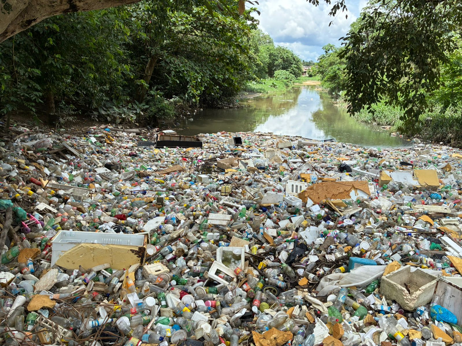 O volume de lixo é tão grande que chega a acobertar o leito do igarapé quase que totalmente.
