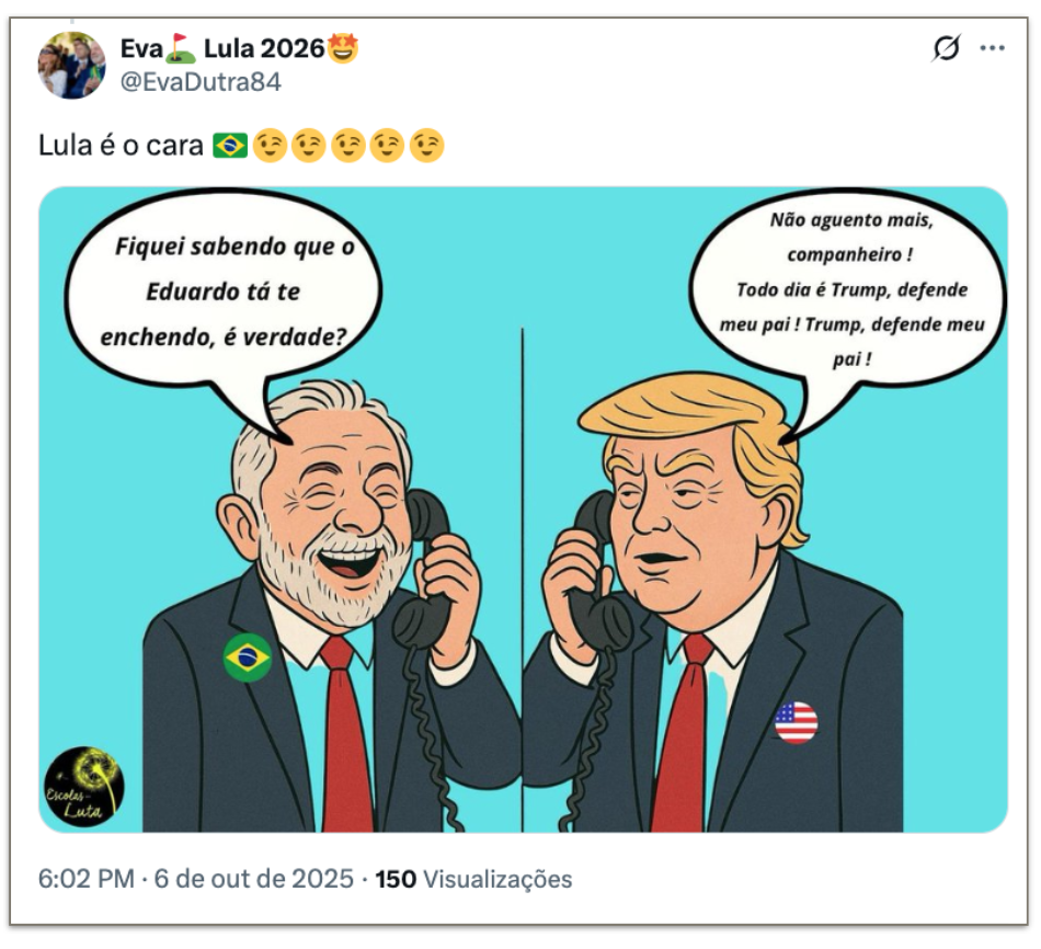 Os memes também ironizam o ex-presidente Jair Bolsonaro (PL), aliado de Trump e adversário de Lula, e o deputado federal Eduardo Bolsonaro (PL), que articula nos EUA sanções contra o Brasil.