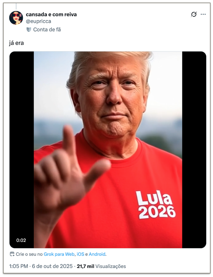 Imagens criadas por IA (inteligência artificial) mostram o republicano “fazendo o L” (gesto associado a lulistas) e usando camisetas vermelhas, cor do PT (Partido dos Trabalhadores), com mensagens de apoio a Lula.