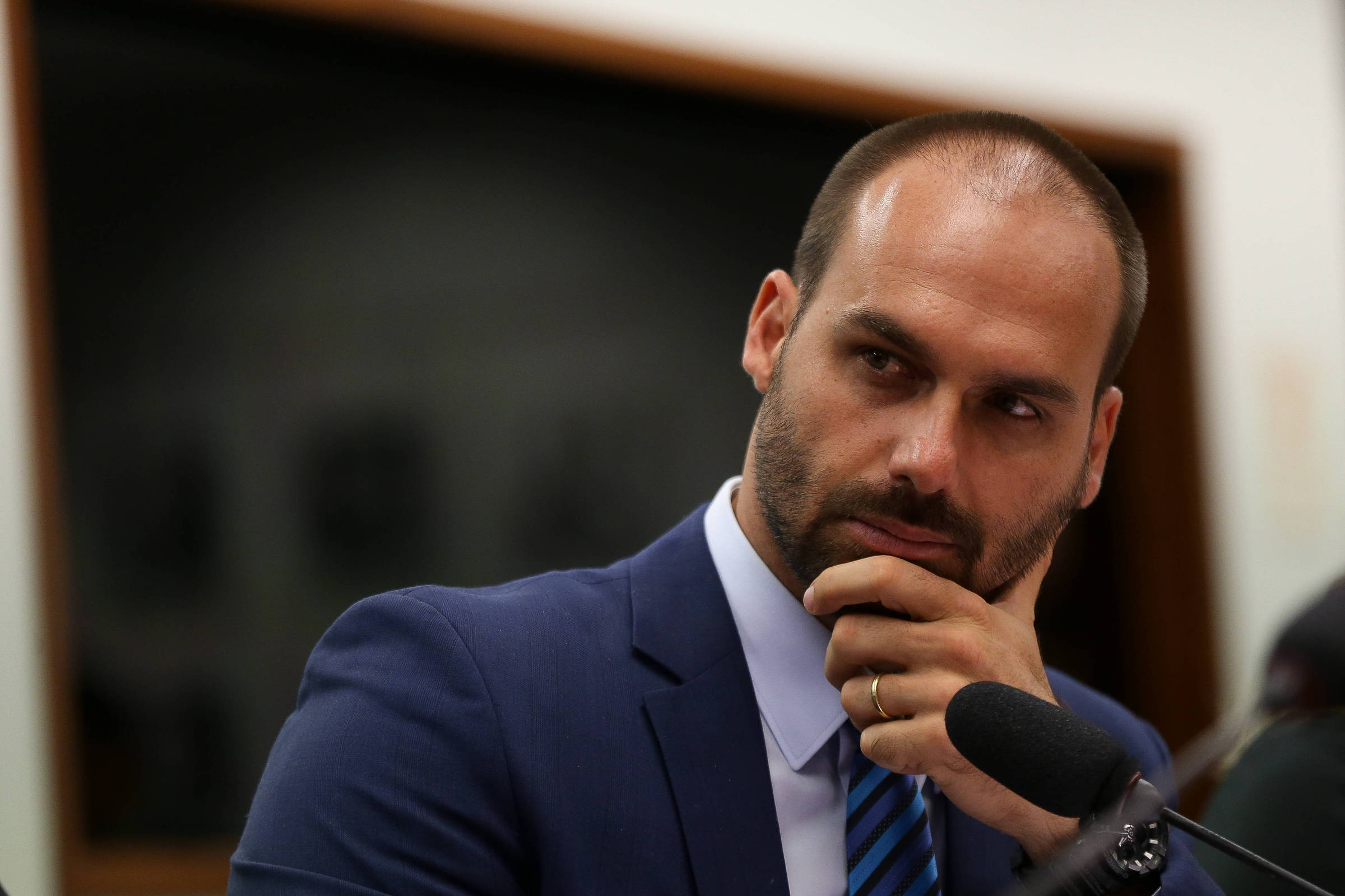 Ao usar seu tempo de fala como líder da minoria, Eduardo Bolsonaro criticou a política antiarmas do atual governo e afirmou que não pode ser "enganado" pela esquerda. "A esquerda pode enganar os outros. A nós, aqui, que já inclusive tomamos inclusive facada de ex-membro do PSOL, não engana em nada".