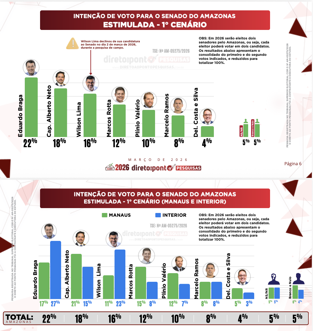 A pesquisa ouviu 1.200 eleitores em Manaus e em 14 municípios do interior entre os dias 27 de fevereiro e 3 de março de 2026. O levantamento tem margem de erro de três pontos percentuais, nível de confiança de 95,5% e está registrado no Tribunal Superior Eleitoral sob o número AM-05275/2026.