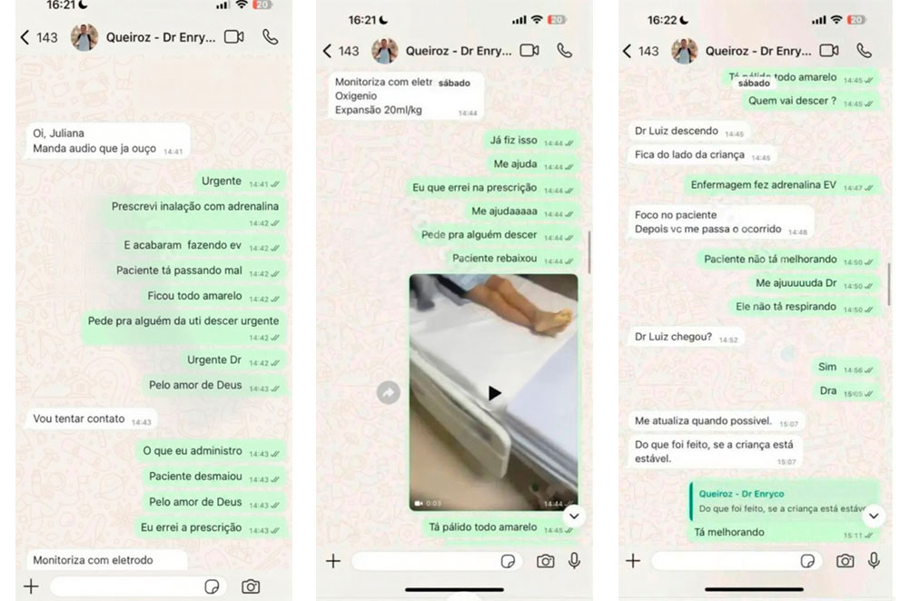 As conversas, que vieram a público nesta sexta-feira (28), teriam sido enviadas ao diretor de plantão da unidade, Dr. Enryko Garcia de Carvalho Queiroz, no momento em que o paciente apresentou piora clínica. Nas mensagens, a médica relata que prescreveu adrenalina para inalação, mas que o medicamento foi administrado por via intravenosa.