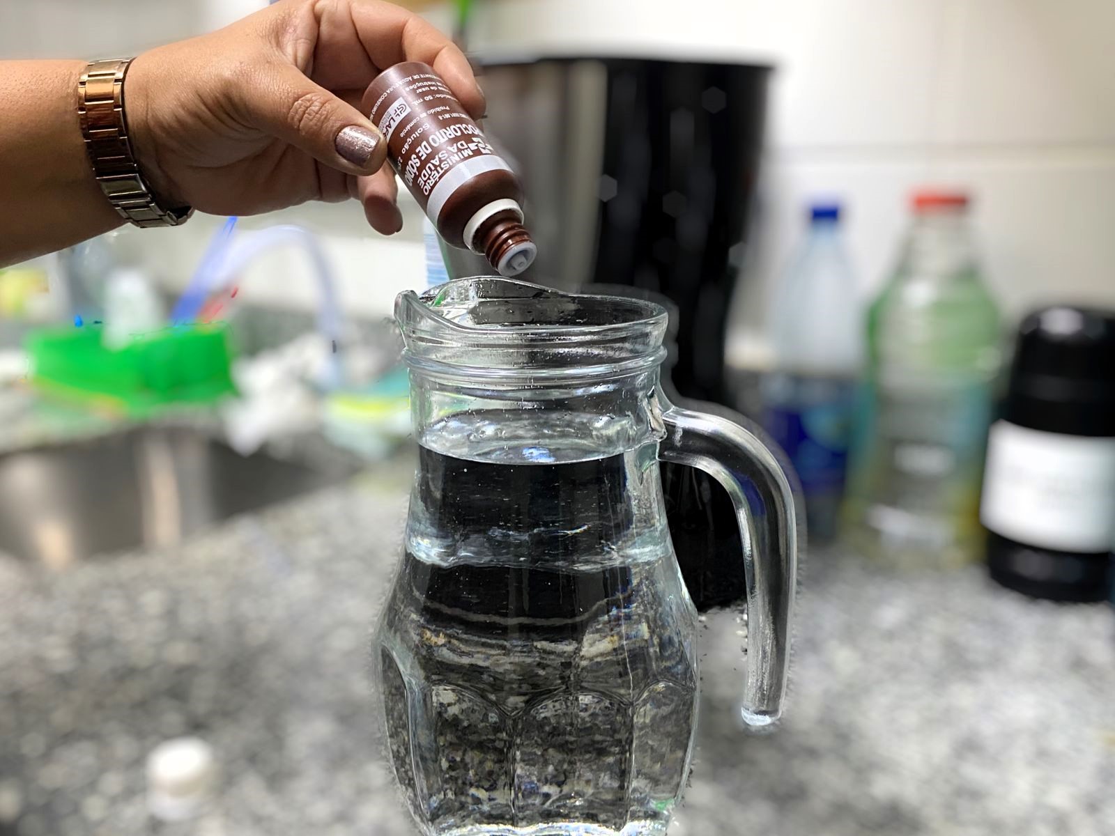 De acordo com os profissionais de saúde, para o tratamento da água para consumo humano recomenda-se colocar 2 gotas de hipoclorito de sódio de concentração a 2,5%, para cada 1 litro de água.