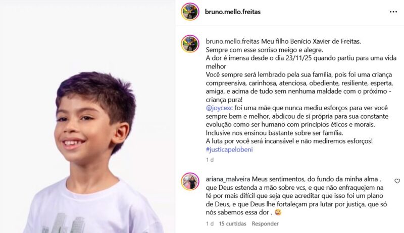 Bruno publicou uma homenagem emocionante ao filho, descrevendo Benício como uma criança “carinhosa, obediente e pura”, e prometeu empenho total para responsabilizar os envolvidos no que classificou como “uma tragédia que poderia ter sido evitada”.