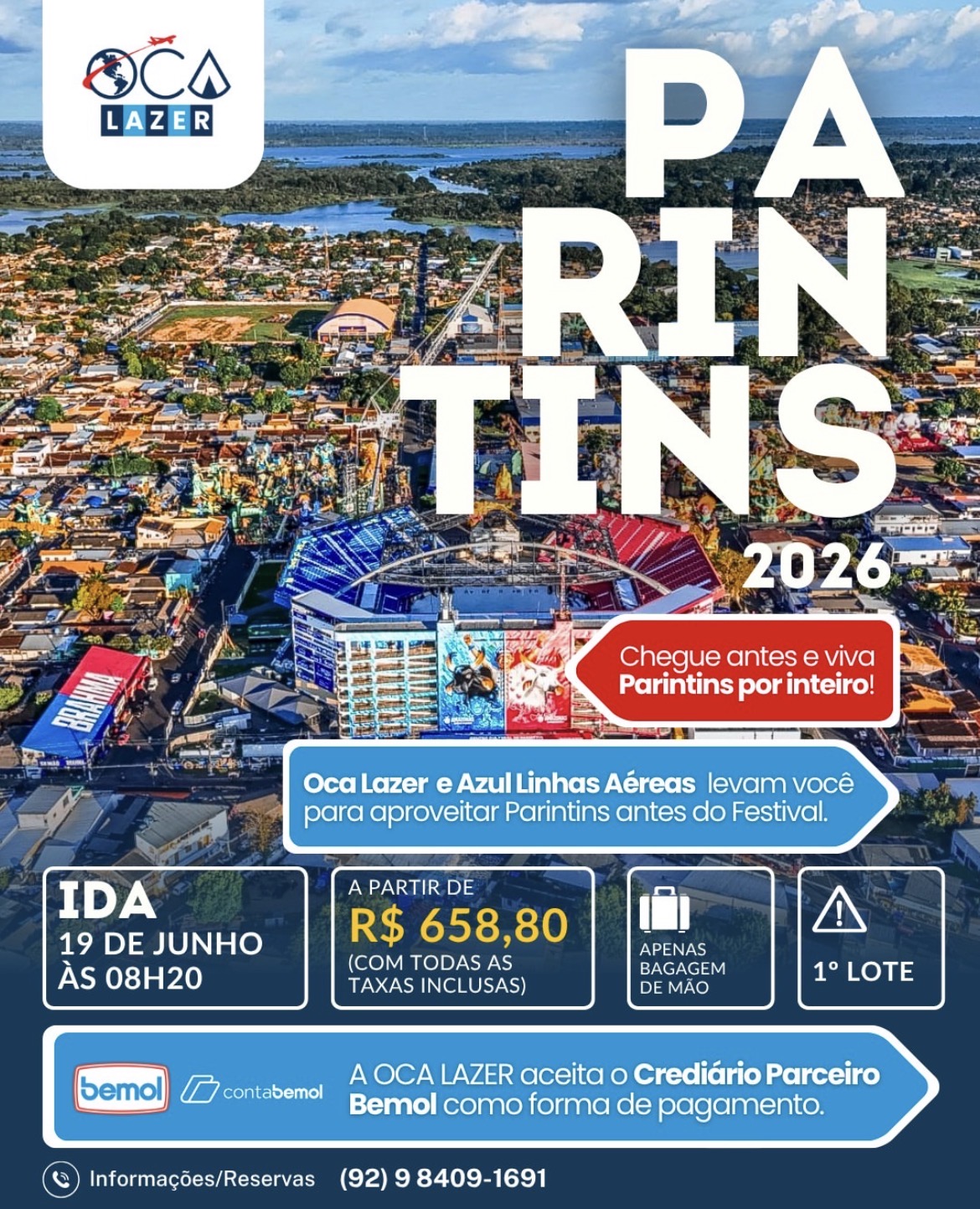 O Festival de Parintins 2026 ainda está longe, mas a movimentação para a maior festa cultural da Amazônia já começou. A Oca Viagens e Turismo, em parceria com a Azul Linhas Aéreas, abriu as vendas de passagens de Manaus para Parintins com embarque no dia 19 de junho de 2026, a pouco mais de uma semana do início oficial da festa dos bois-bumbás.