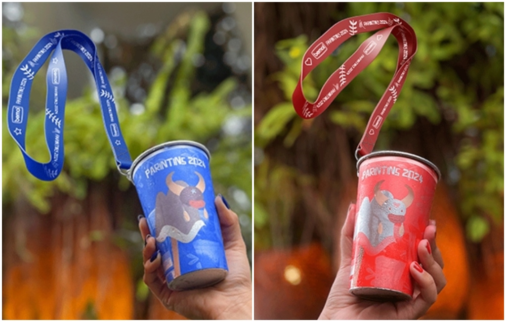 Os copos, com representação dos bois mais amados do Festival de Parintins, mudam a cor para vermelho ou azul com líquido gelado. O brincante ainda leva seu copo com segurança e para qualquer ambiente da festa já que vem acompanhado de um tirante personalizado.