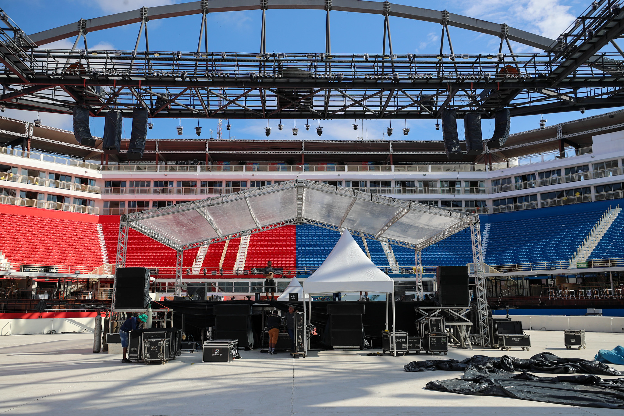 A segunda etapa do trabalho contemplou a montagem do palco, iluminação e som. Para proteger o piso da arena, o local onde foi montado o palco recebeu proteção com carpete de madeira, evitando pressão na região onde está instalada a estrutura de alumínio. A montagem do som e iluminação foi feita em mesas independentes e não comprometem as apresentações dos bumbás.