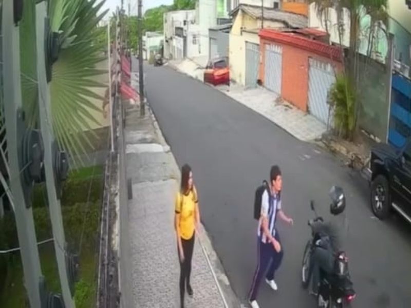 Imagens registradas por câmeras de segurança mostram o momento em que o suspeito se aproxima de um casal que caminhava pela rua. Ao perceber a abordagem, o homem reage, derruba o suspeito da motocicleta e entra em luta corporal com ele.