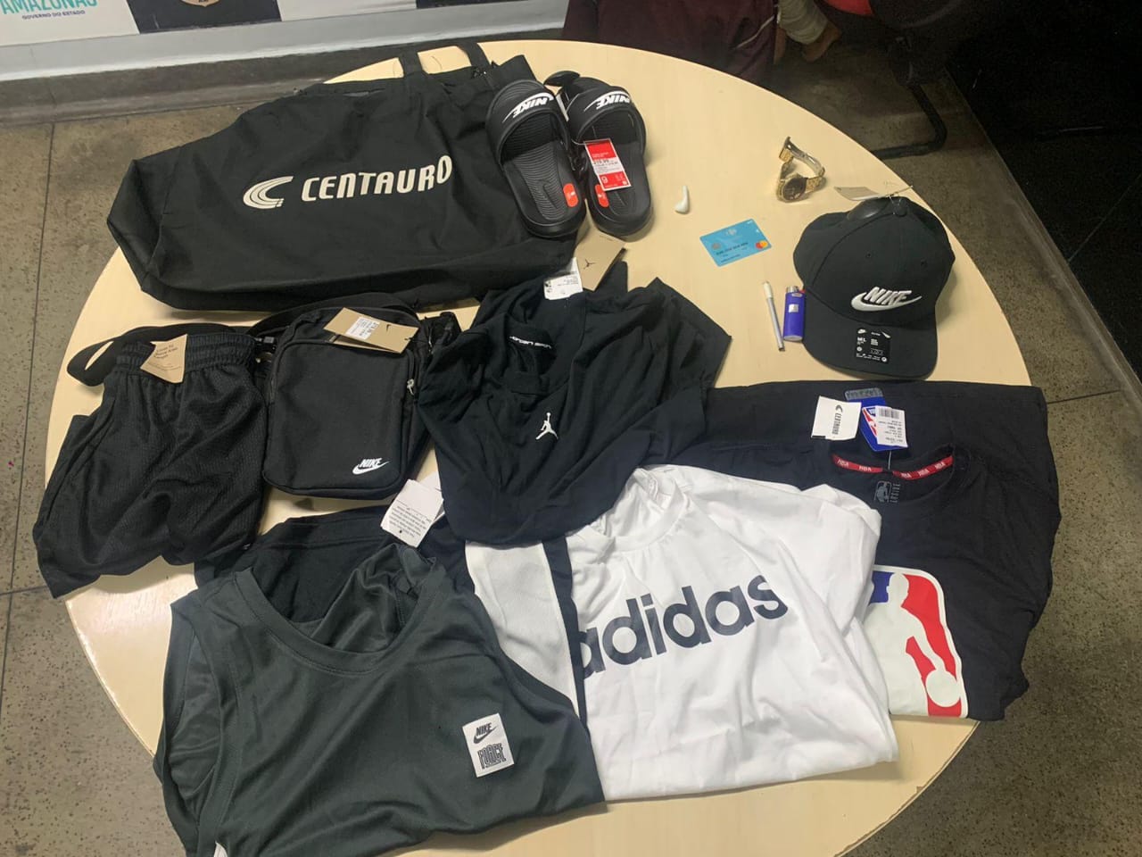 Segundo informações da polícia, o suspeito tentou sair da loja Centauro com diversas peças de roupa, incluindo bolsas e bonés, escondidas em uma bolsa, sem efetuar o pagamento.