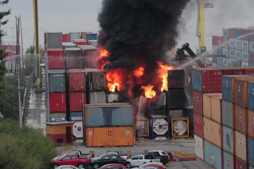 Conforme os bombeiros, um raio teria atingido um contêiner e iniciado o incêndio no local. Pelo menos seis contêineres já haviam sido atingidos pelo fogo, até a chegada da primeira equipe. Ainda segundo os bombeiros, 35 contêineres estão dispostos na área.