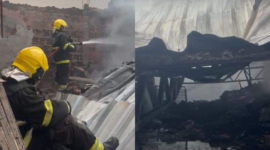 Rapidamente as chamas se espalharam pelo local. Os bombeiros conseguiram conter o incêndio. Devido ao calor, a estrutura metálica que cobria o galpão cedeu.