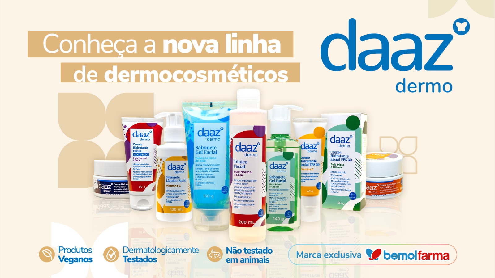 A Daaz, marca vendida exclusivamente na Bemol Farma, lança a linha Daaz Dermo que chega as farmácias da rede com 19 lançamentos distribuídos em quatro linhas: a linha para pele mista e oleosa, linhas vitamina C e anti sinais, linha para pele normal e seca, além de linhas para todos os tipos de pele.