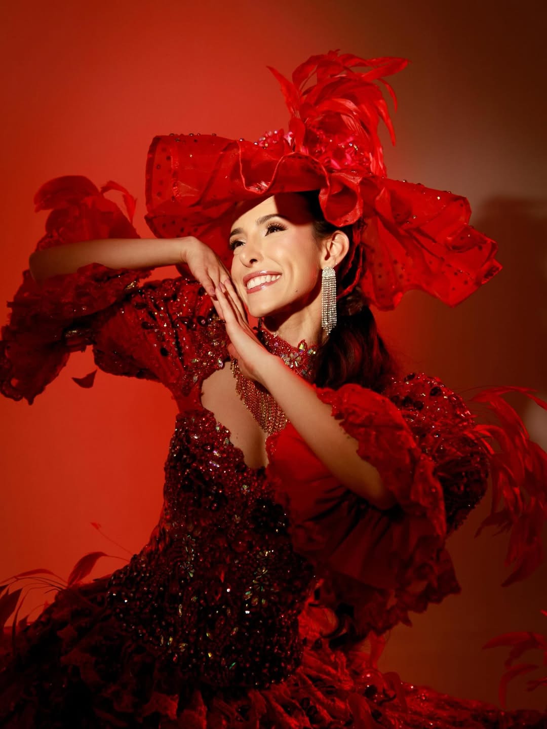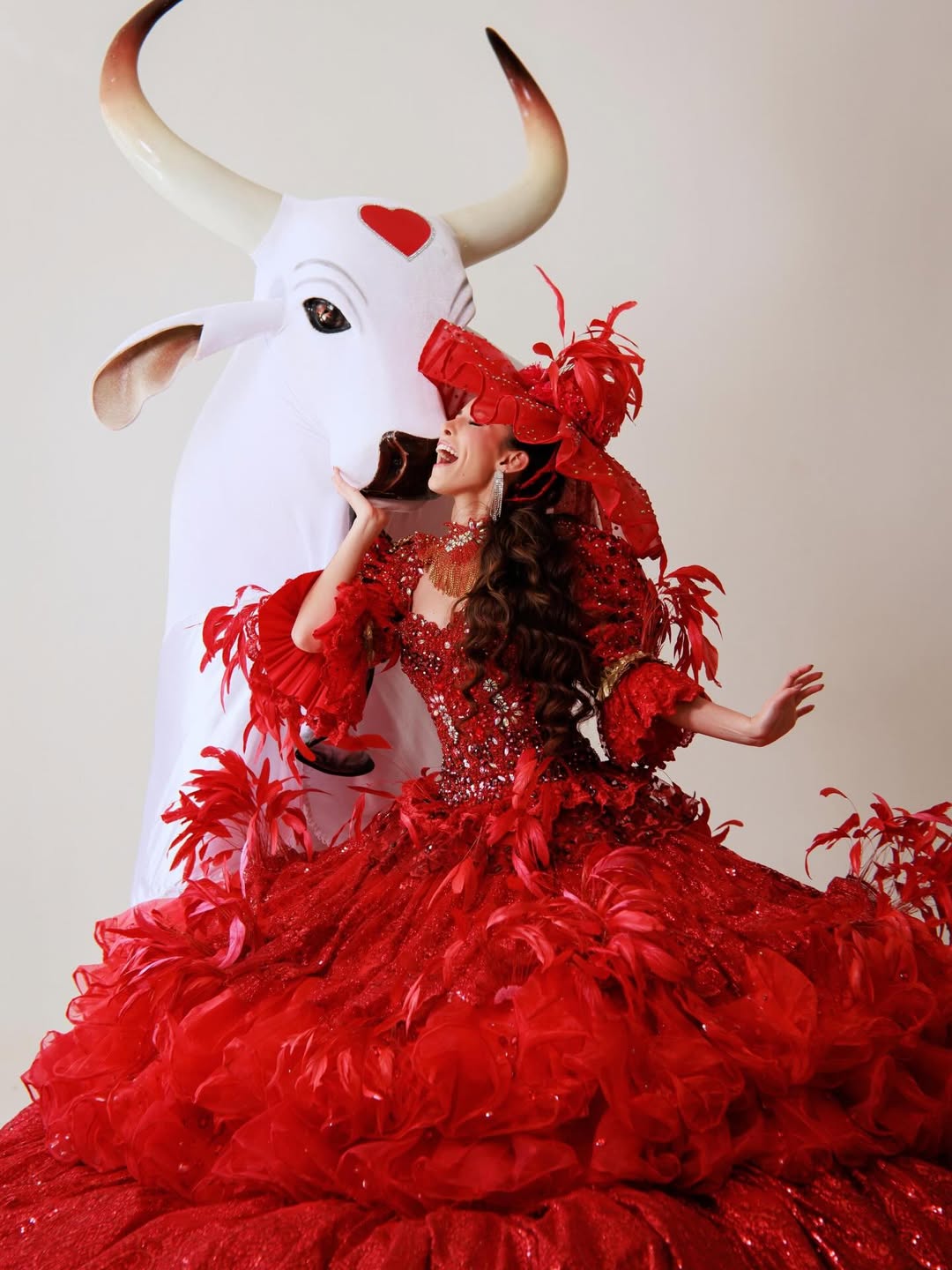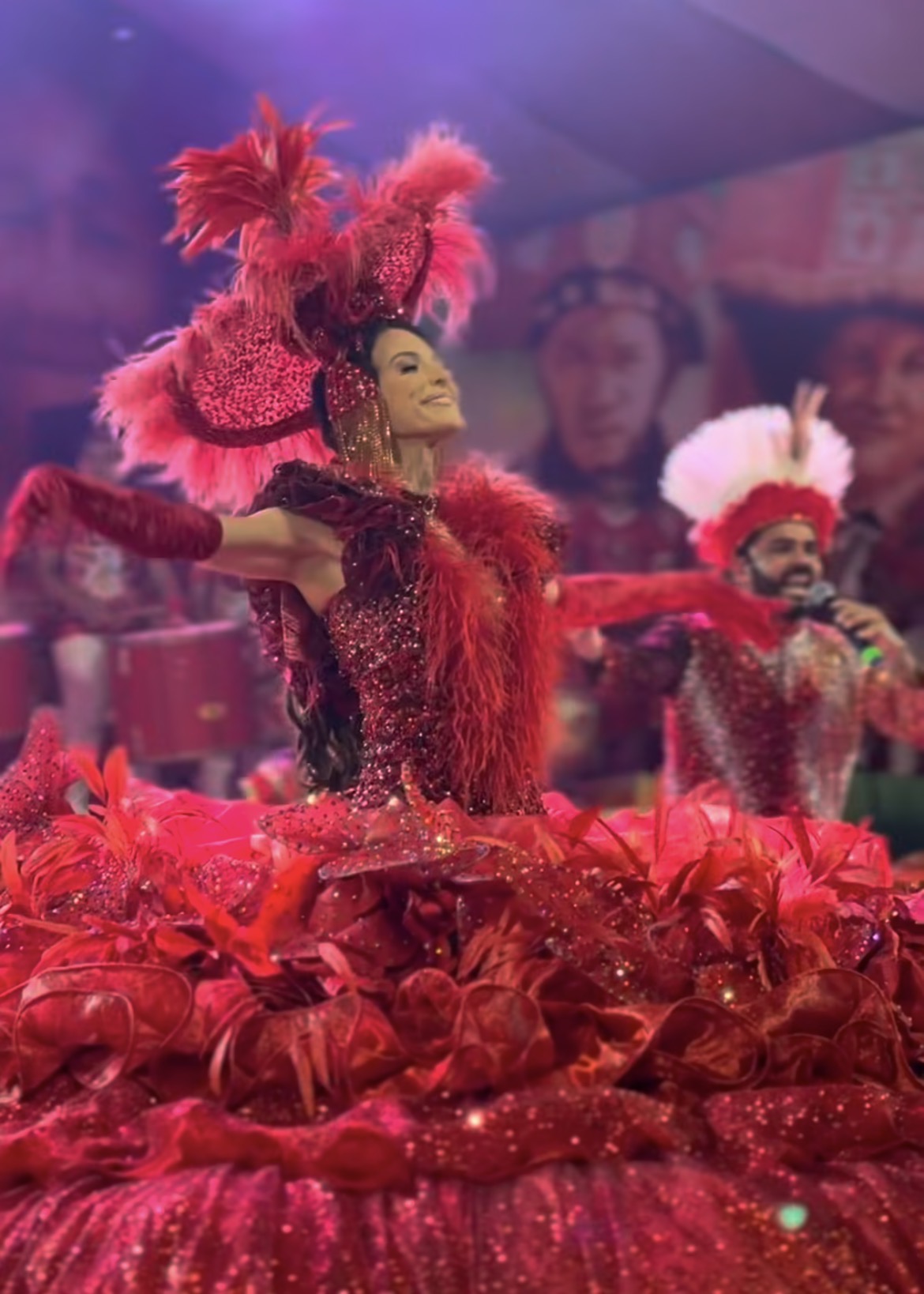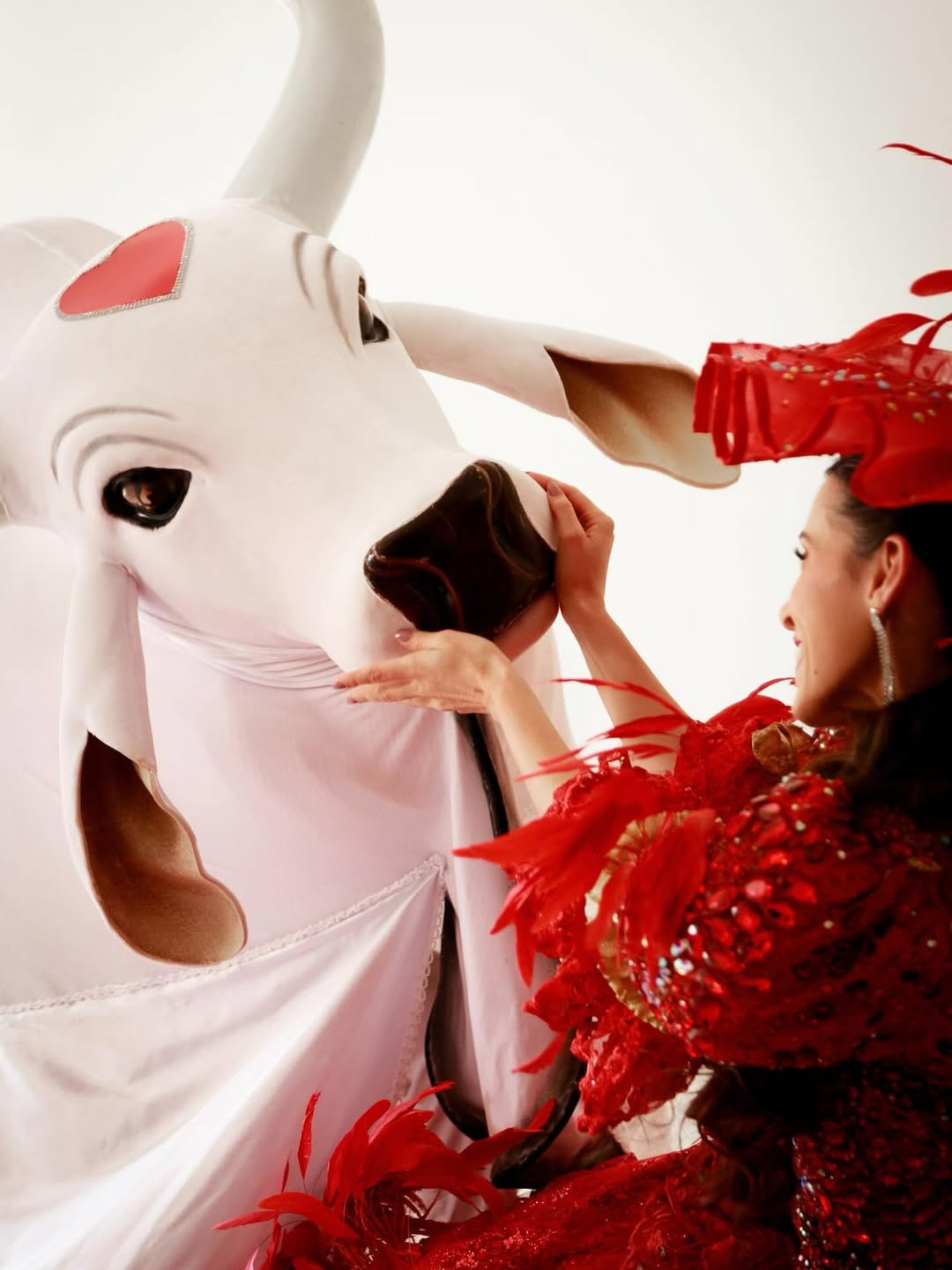 O vestido marca também a primeira criação de Djane Senna para o Garantido após um período afastada, o que confere à peça um caráter de retorno simbólico. “Apostamos no vermelho que tanto amamos”, explica a artista, reforçando o vínculo afetivo com o boi e com a história construída na arena.