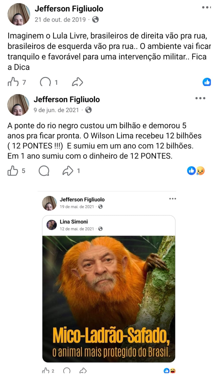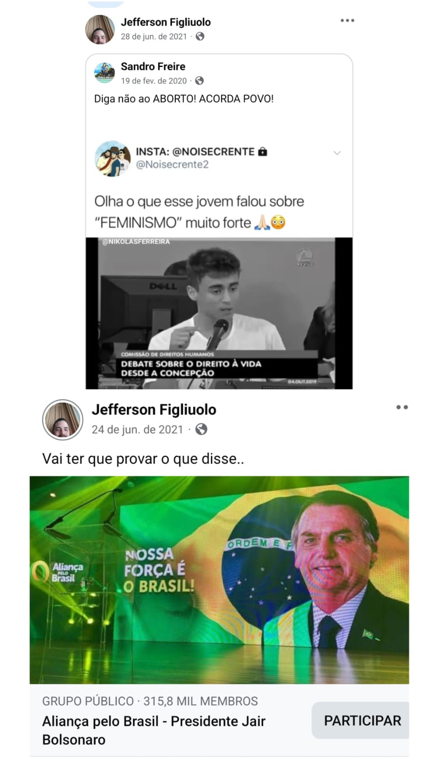 Entre as publicações, há conteúdos relacionados ao ex-presidente Jair Bolsonaro e ao deputado federal Nikolas Ferreira, além de críticas a veículos de imprensa, como a Rede Globo, e a jornalistas. Também aparecem manifestações contrárias ao aborto e comentários direcionados a políticos do Amazonas, como o senador Omar Aziz.