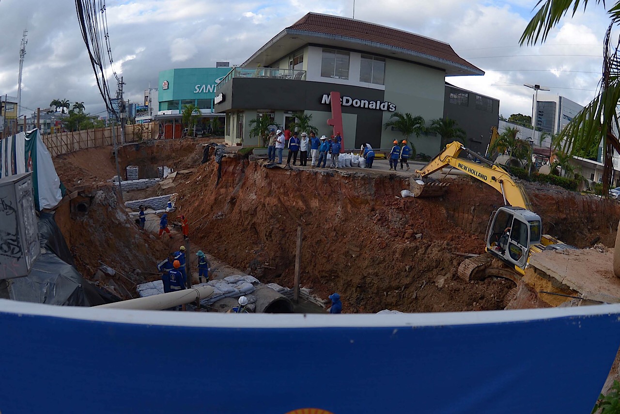 “Nossas equipes atuam de segunda a sábado no local. O trabalho segue em ritmo mais cauteloso e sem prazo para conclusão por conta da necessidade de se criar um desvio na rede de drenagem que passava por baixo de uma rede de lanchonete (McDonalds) e um posto de gasolina (Posto 700) instalados na área”, diz a Seminf em nota.