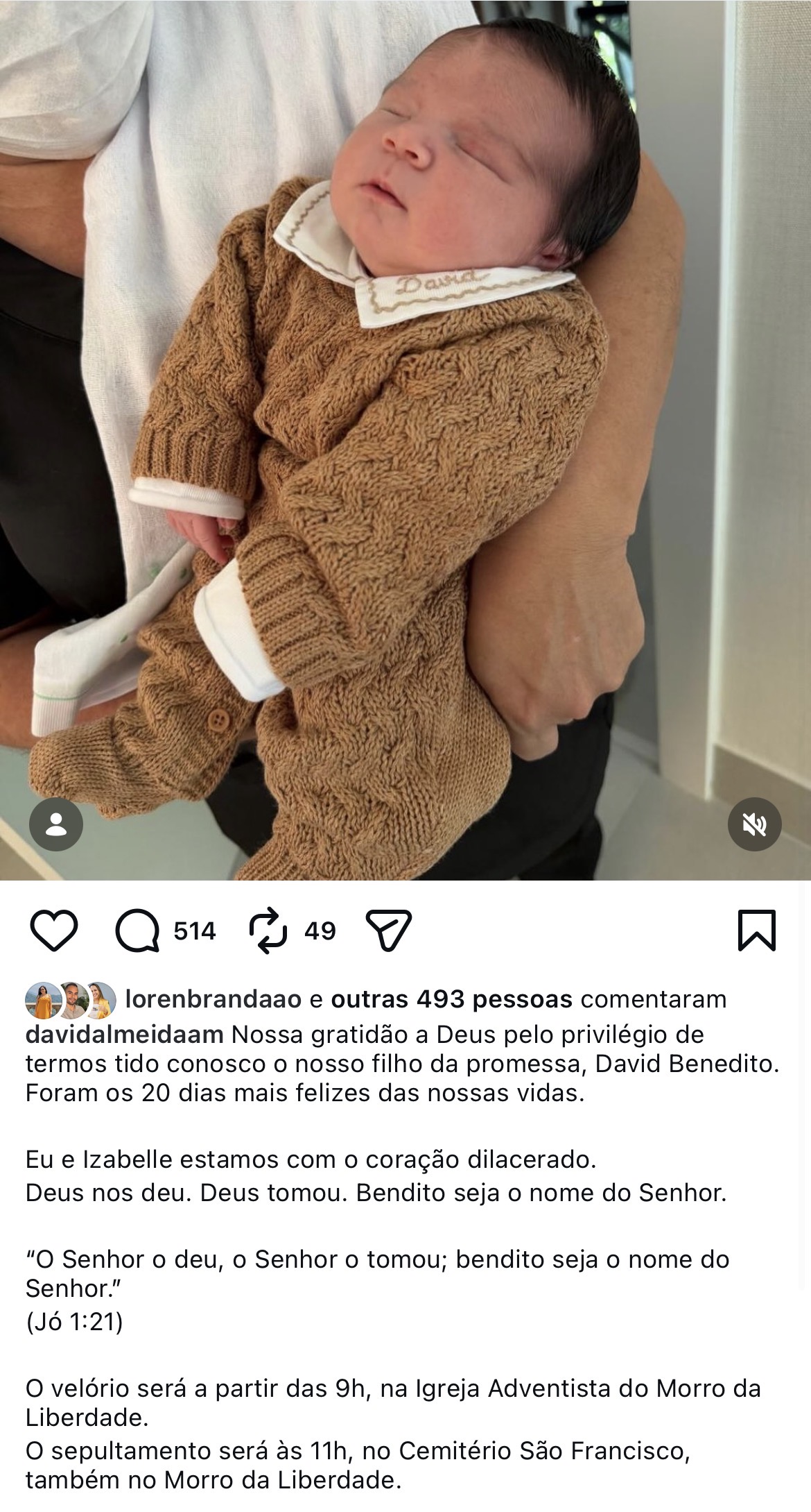 David Benedito era o filho mais novo do prefeito e sua morte causou grande comoção entre amigos, familiares e pessoas próximas ao chefe do Executivo municipal. Ele tinha apenas 20 dias de vida.