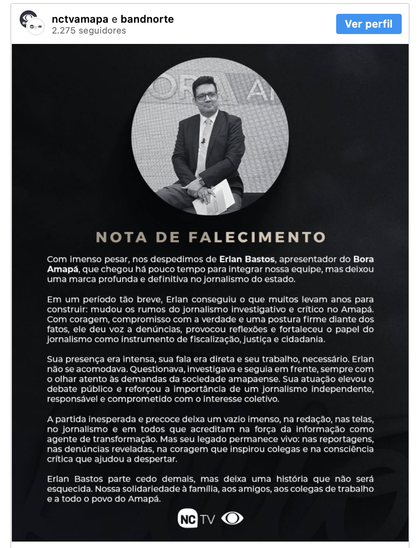 "Com imenso pesar, nos despedimos de Erlan Bastos, apresentador do Bora Amapá, que chegou há pouco tempo para integrar nossa equipe, mas deixou uma marca profunda e definitiva no jornalismo do estado", informou a NC TV Amapá em um comunicado publicado nas redes sociais.