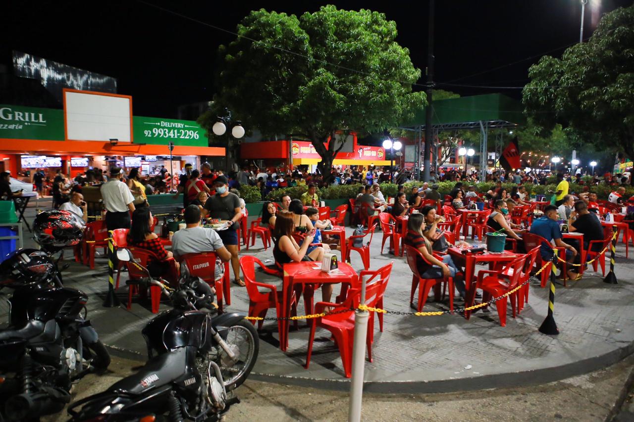Dos oito bares fechados, três extrapolaram o horário permitido e cinco estavam lotados e com mesas pela rua. Na avenida Itaúba, bairro Jorge Teixeira, zona leste da capital amazonense, uma grande aglomeração foi dispersada. No local, tinham diversos veículos estacionados no meio da via e mais de 200 pessoas aglomeradas.
