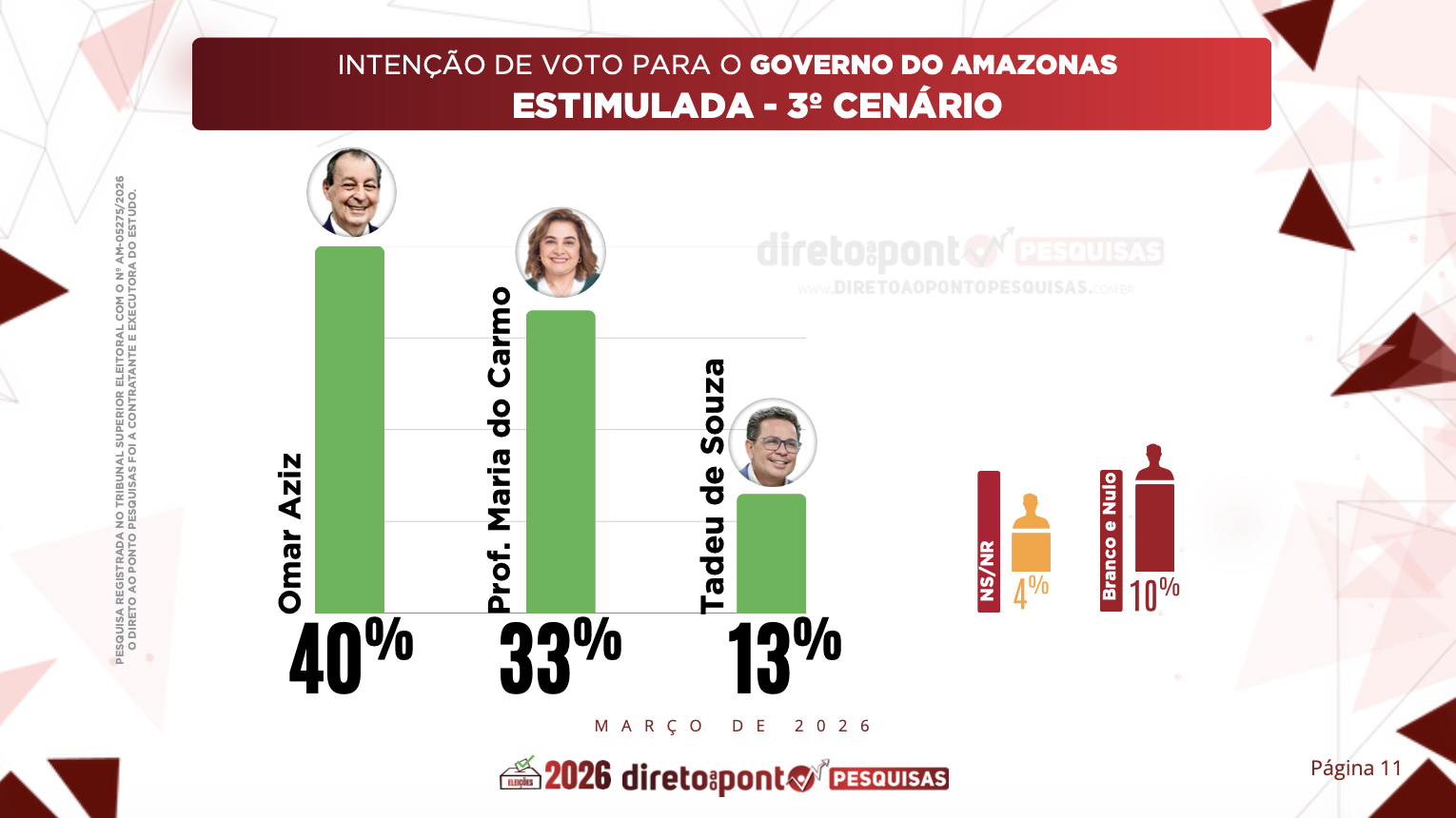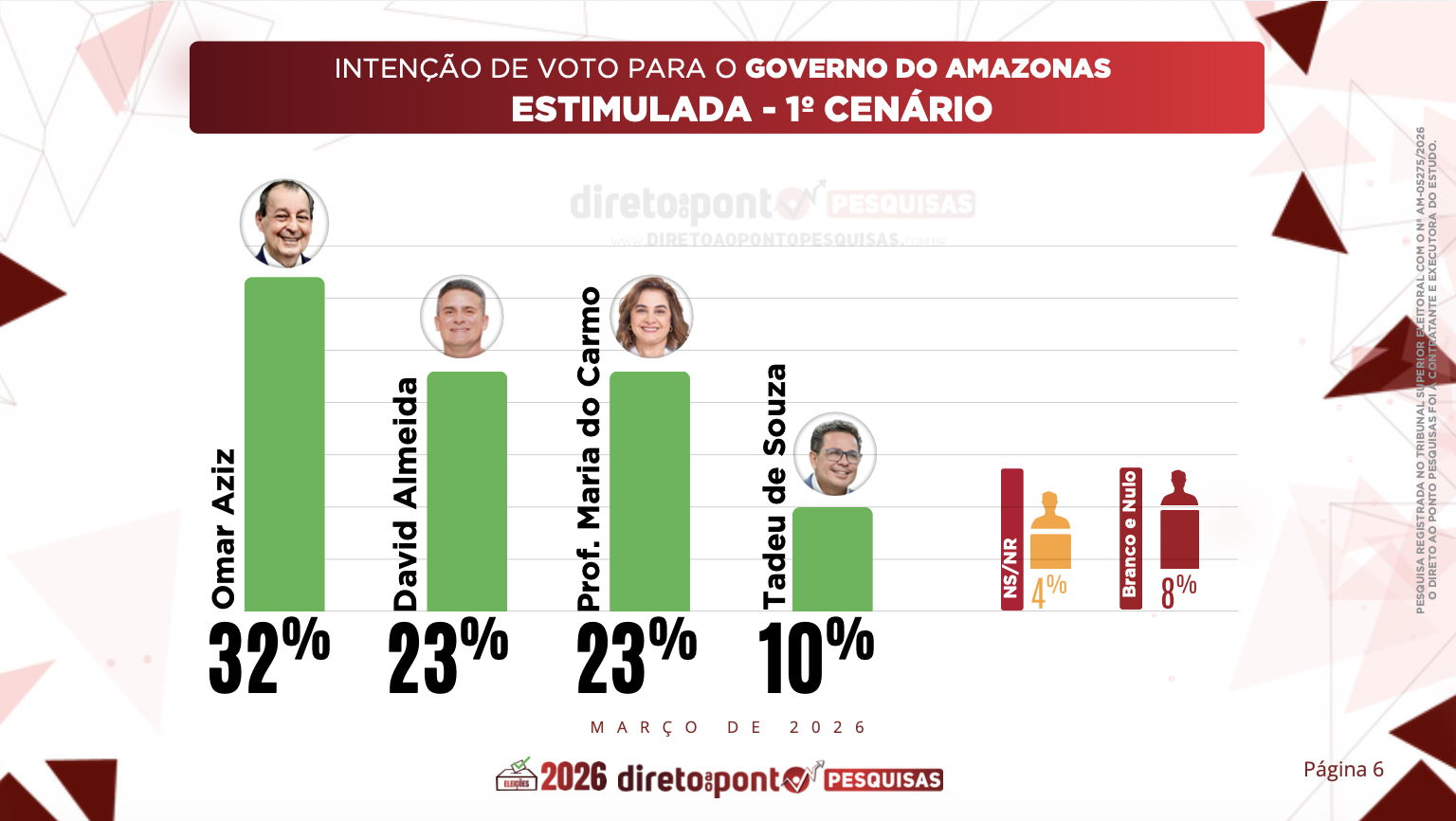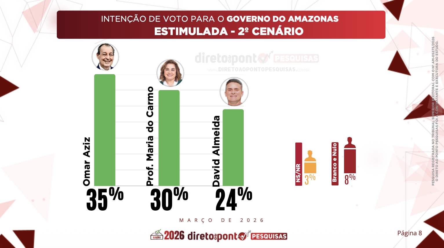 O levantamento foi realizado entre os dias 27 de fevereiro e 3 de março de 2026, com 1.200 entrevistas em Manaus e em 14 municípios do interior, com margem de erro de 3 pontos percentuais e nível de confiança de 95%.