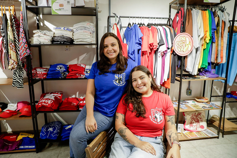 É na loja do empresário que a Juliana Landim, de 29 anos, e a Maysa Fagundes, de 29 anos, expõem os produtos da marca delas, voltada para camisetas, ecobags e lenços. De acordo com Juliana, a ideia de produzir algo específico sobre os bumbás surgiu junto com a retomada e crescimento da festa, em 2022.