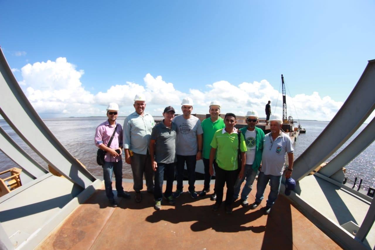 O prefeito em exercício Tony Medeiros e o secretário de Obras, Mateus Assayag, estiveram na manhã desta sexta-feira, 12/07, recebendo a estrutura flutuante do novo porto da Vila Amazônia. A obra é feita pelo Governo Federal, através do Ministério dos Transportes em parceria com a Prefeitura de Parintins.