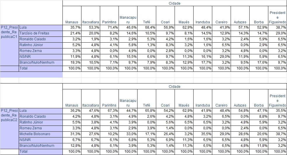 - Manaus – 35,7% (Contra Tarcísio) - 36,2% (Contra Michelle)