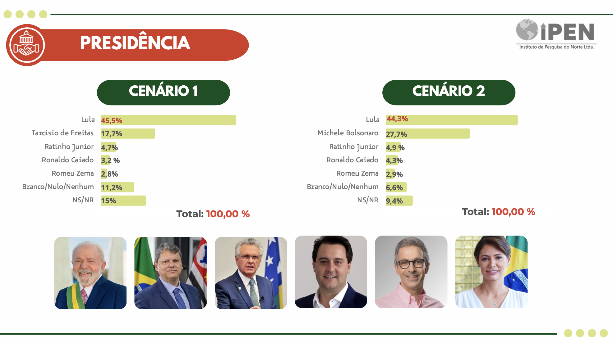 No cenário 2, Lula também venceria, com 44,3%; Michele Bolsonaro apresenta desempenho melhor que Tarcísio, chegando a 27,7%; Ratinho Júnior teria 4,9%; e Romeu Zema, 2,9%. Brancos e nulos diminuiriam para 6,6% e não sabem, 9,4%.
