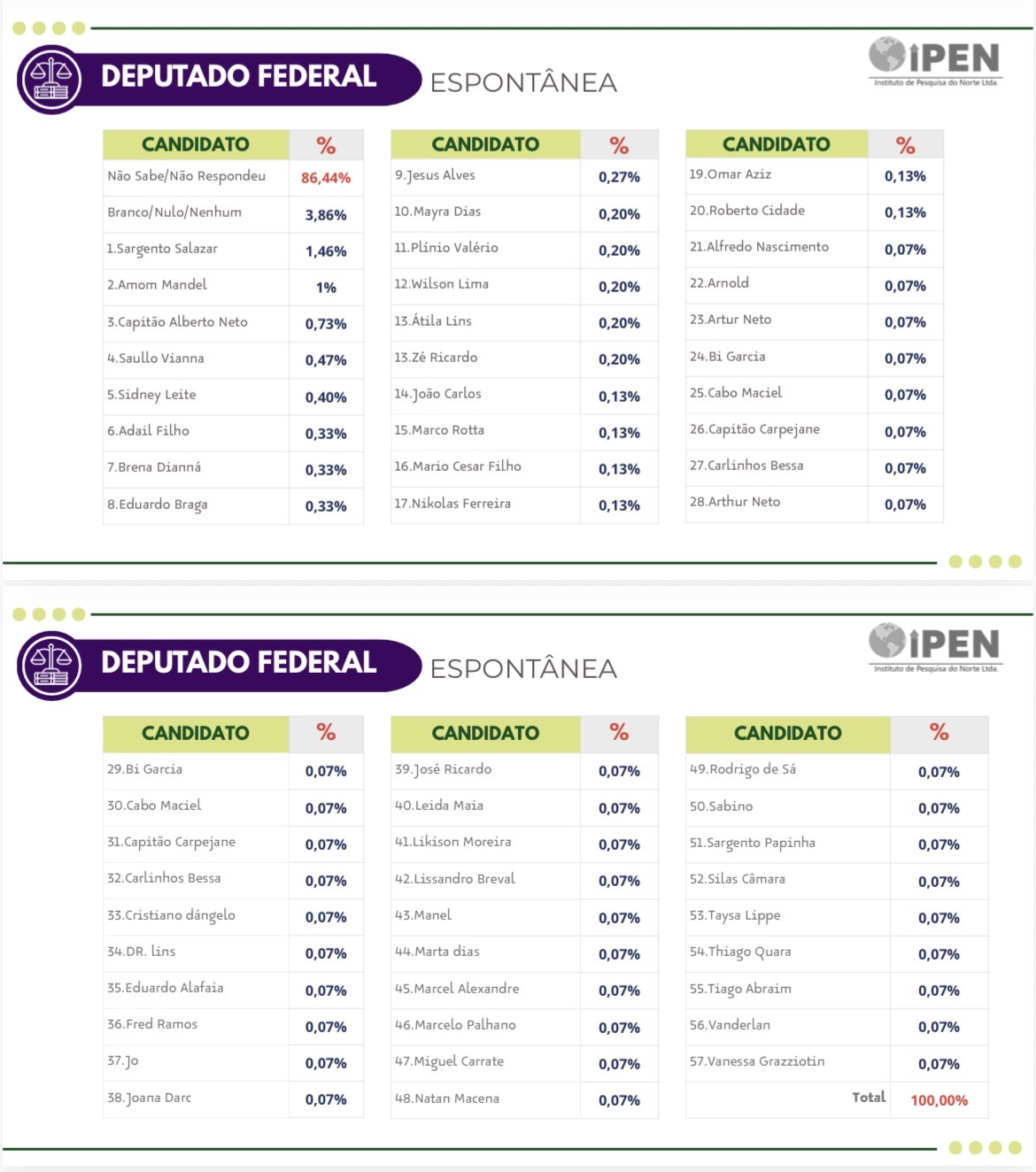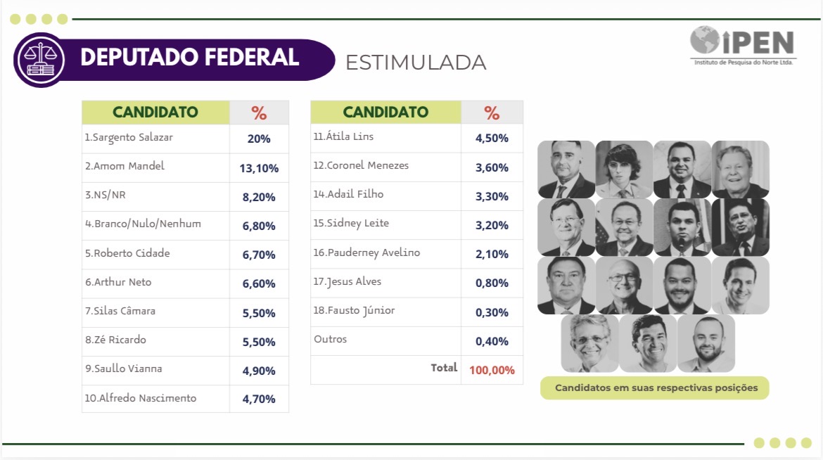 A nova pesquisa do Instituto de Pesquisa do Norte (IPEN), contratada pelo Consórcio G6, revela o primeiro desenho consistente da disputa por vagas na Câmara Federal em 2026. Os números mostram Sargento Salazar (PL) isolado na liderança e Amom Mandel (Cidadania) firmando-se como o segundo nome mais forte do Amazonas para a Câmara dos Deputados.