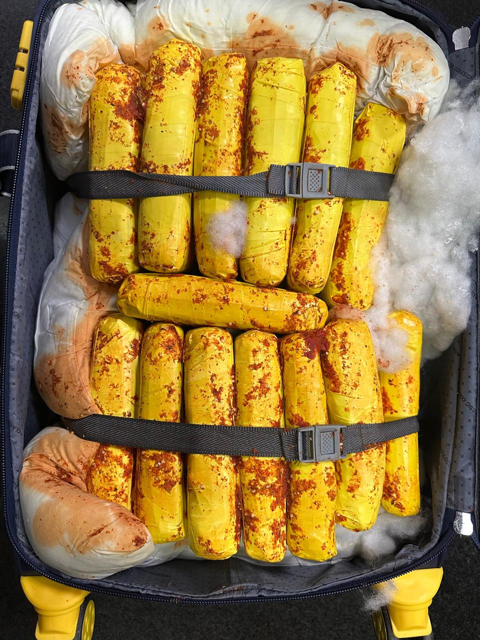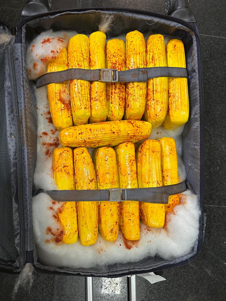 A ação ocorreu durante fiscalização de rotina em bagagens despachadas de um voo comercial com destino ao Aeroporto Internacional de Guarulhos, em São Paulo. Policiais federais identificaram imagens compatíveis com material suspeito em três malas. Após abertura e conferência do conteúdo, foram encontrados 34 tabletes da substância ilícita.