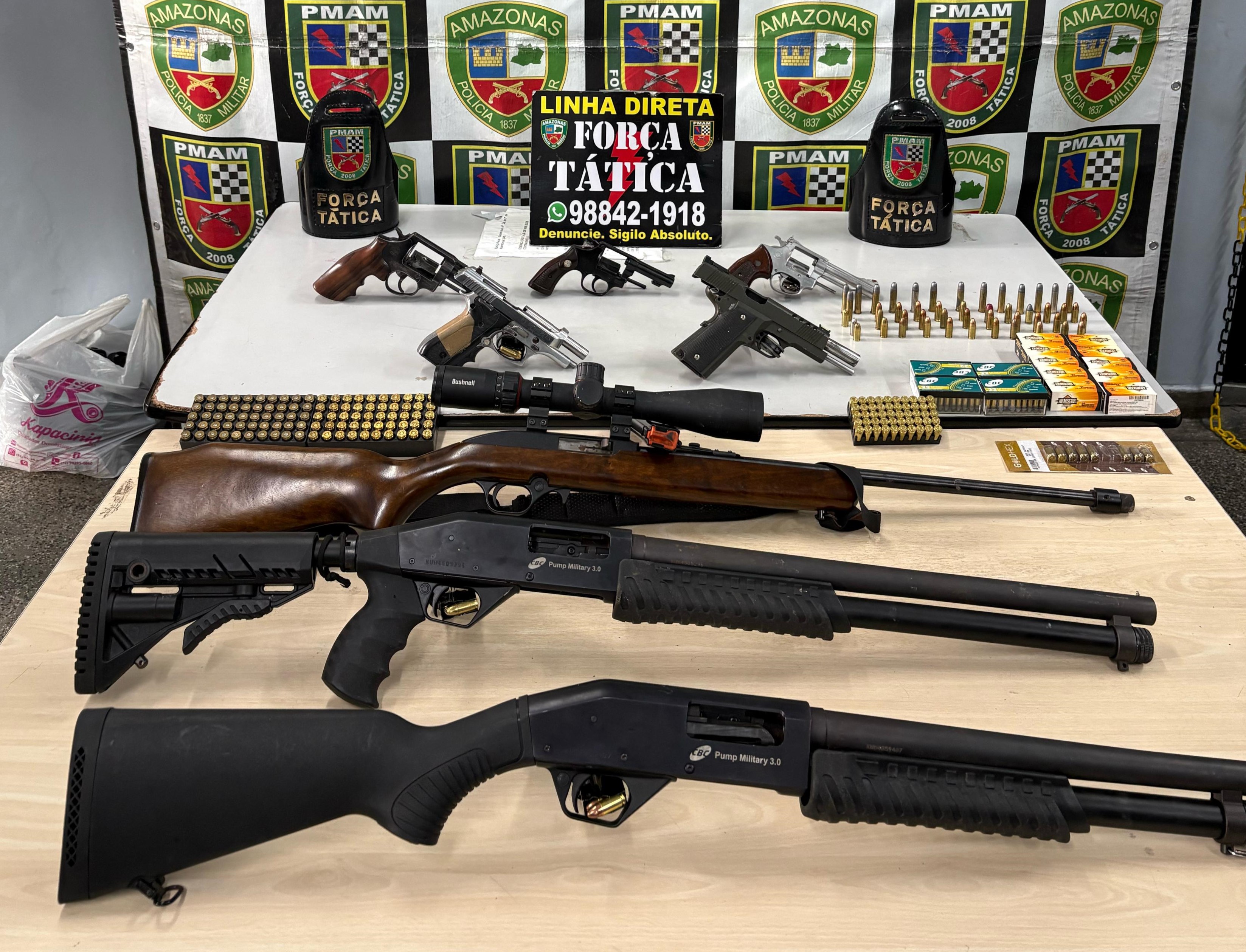 Um arsenal de armas de fogo foi apreendido pela Polícia Militar do Amazonas (PMAM), por meio da Força Tática, na tarde de sexta-feira (11/04), em uma residência localizada na rua 71, no bairro Novo Aleixo, zona norte da capital. A ação foi executada após uma denúncia de violência doméstica, feita por uma mulher, durante uma transmissão ao vivo em uma emissora de televisão.
