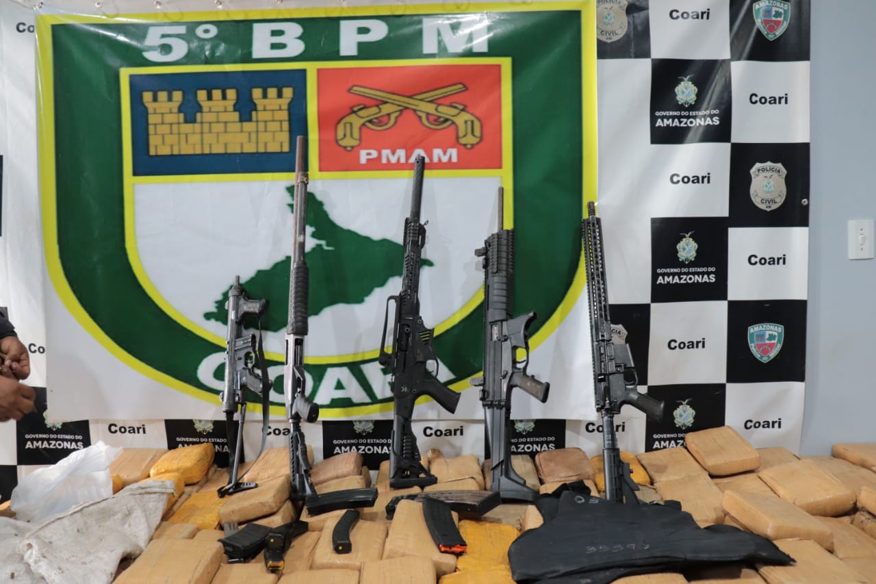 Além de três carregadores 5,56, quatro carregadores 9mm; 194 munições de 5,56; 195 munições 9mm; 87 munições de 12 e 849,85 kg de maconha, tipo skank. A ocorrência foi finalizada no 10º Distrito Integrado de Polícia de Coari (DIPC).