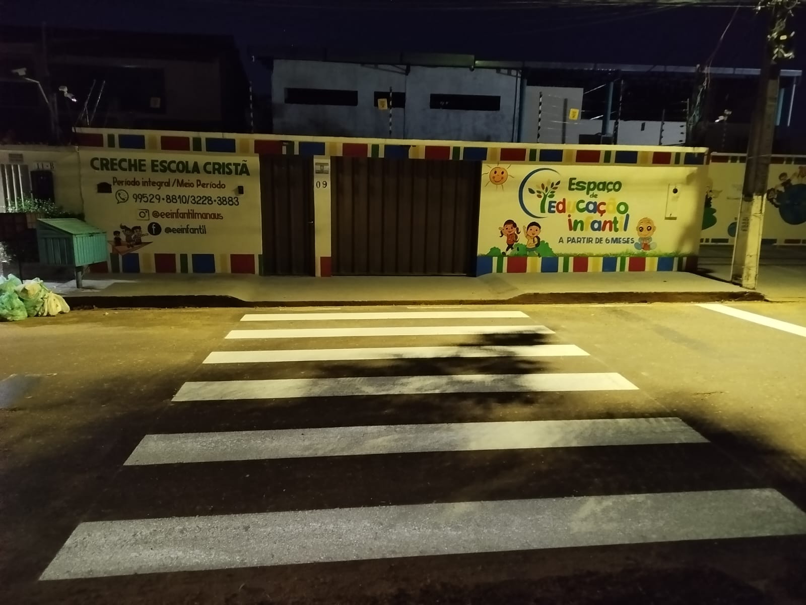 Na rua Mozart Guarnieri, em frente à creche escola Cristã, no Parque 10 de Novembro, zona Centro-Sul, foram instaladas faixas de pedestre e a legenda "Escola", com o objetivo de garantir a segurança dos pedestres durante a travessia.