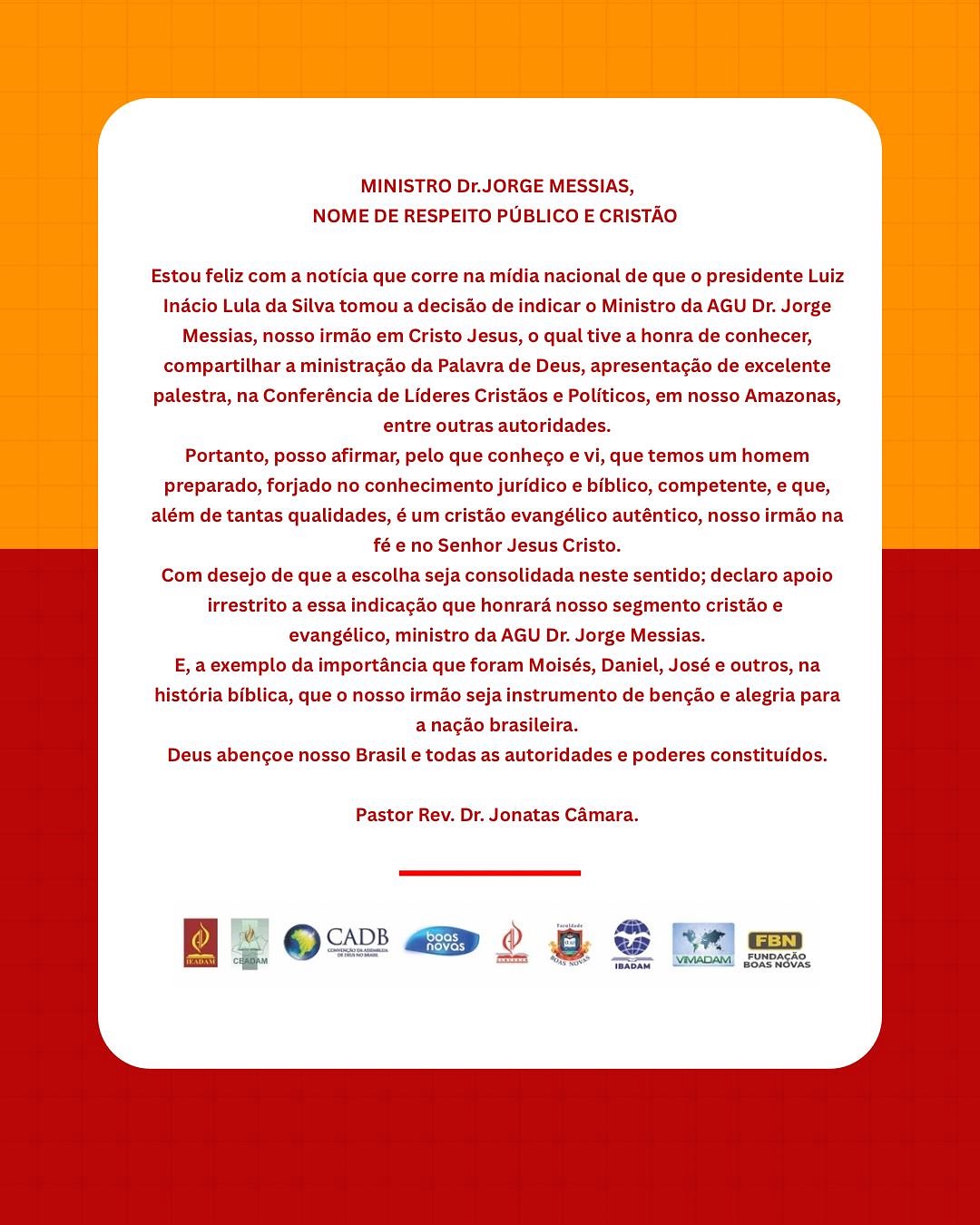 O pastor evangélico Jonatas Câmara, presidente da Igreja Assembleia de Deus no Amazonas (IEADAM), manifestou apoio à possível indicação do ministro Jorge Messias, atual chefe da Advocacia-Geral da União (AGU), ao Supremo Tribunal Federal (STF). O nome de Messias vem sendo considerado pelo presidente Luiz Inácio Lula da Silva (PT) para ocupar a vaga deixada por Luís Roberto Barroso, que antecipou sua aposentadoria. A matéria é do site Onda Digital.