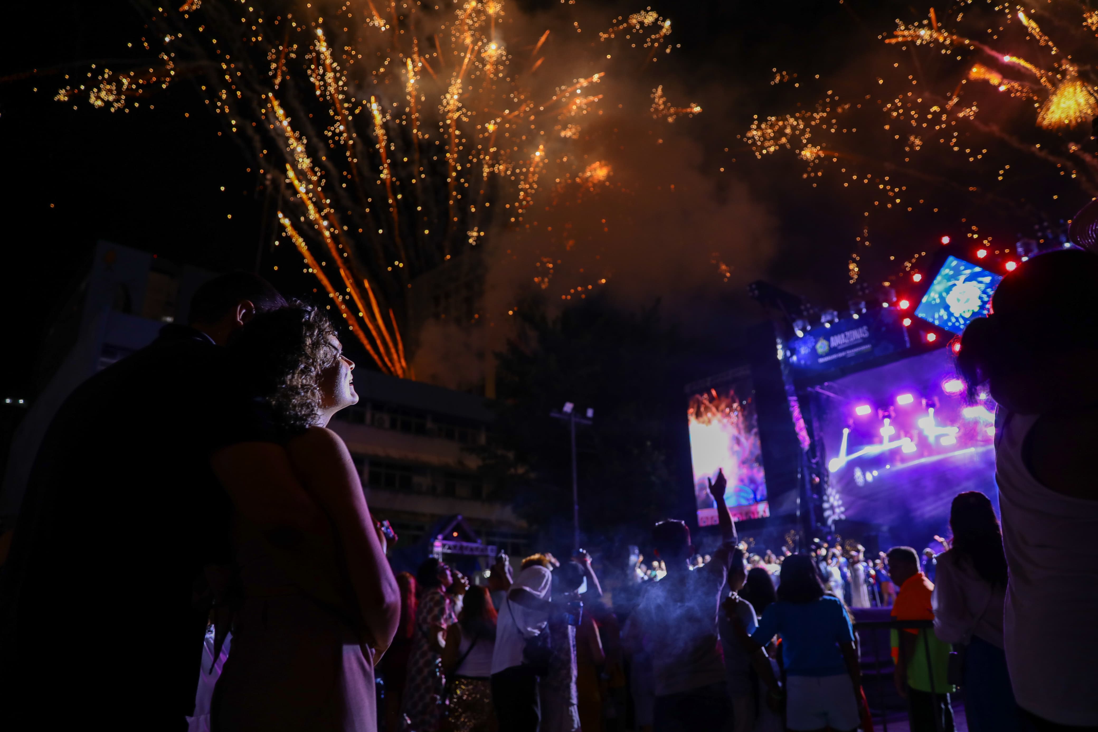 À meia-noite, a queima de fogos, de aproximadamente dez minutos, encantou o público, com uma trilha sonora especial que colocou todos para dançar enquanto o show pirotécnico acendia o céu do Centro Histórico de Manaus.
