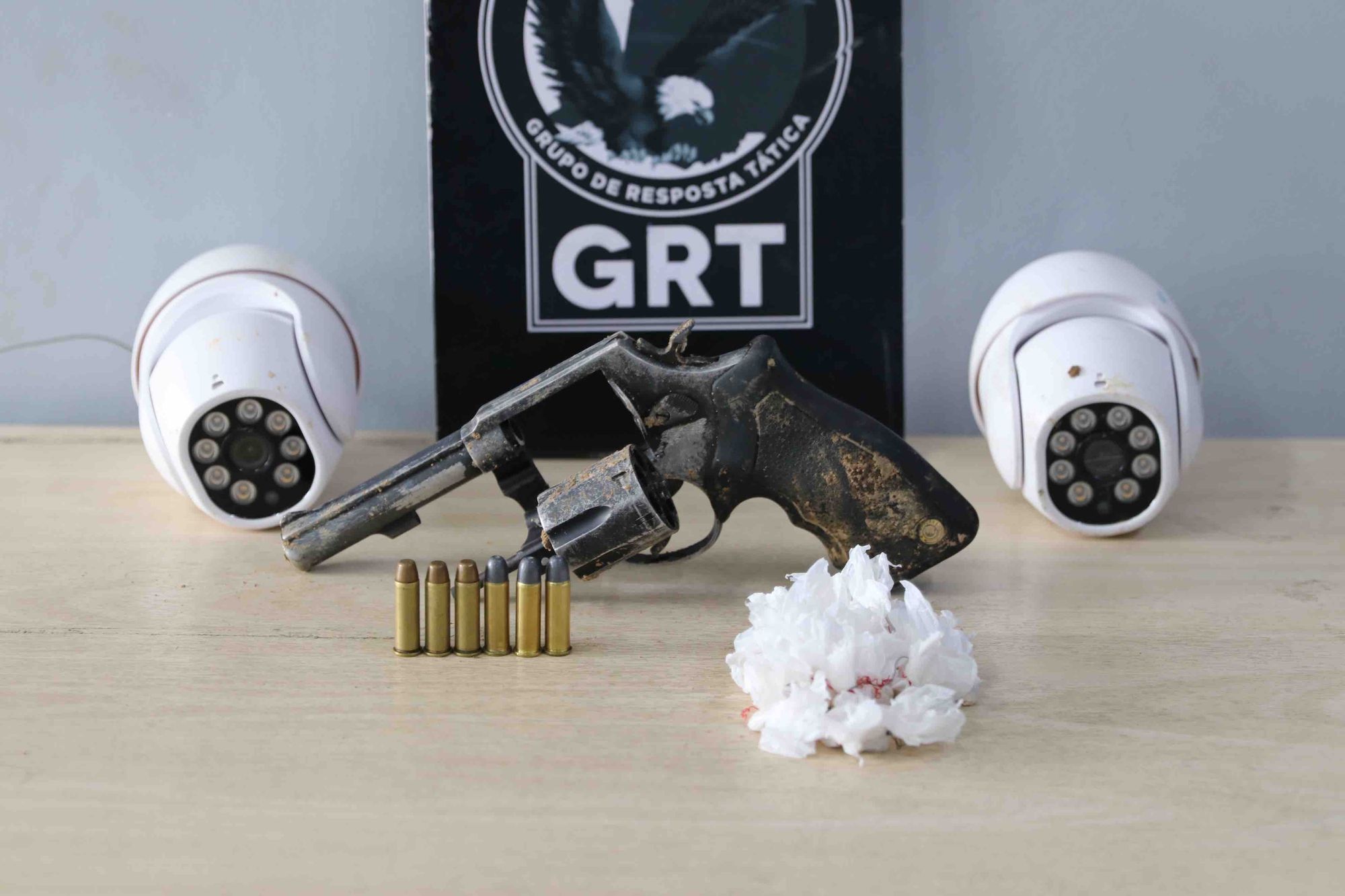 Durante a revista foi encontrado um revólver calibre 38 com seis munições intactas e 29 porções de oxi. Após verificação dos agentes, foi constatado que ele tinha um mandado de prisão pelo crime de homicídio e seria o líder do tráfico na região. As equipes identificaram, ainda, que o homem era o responsável por duas câmeras instaladas em postes de energia para monitorar a atividade policial, que também foram apreendidas.