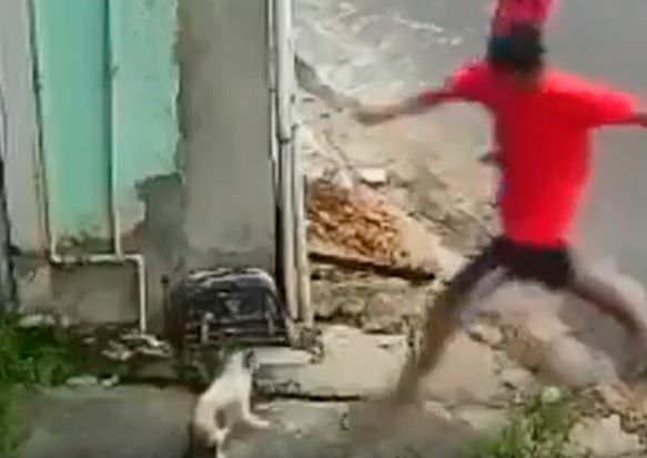 As imagens mostram o momento em que o suspeito esfaqueia um cão a sangue frio (o animal faleceu, posteriormente) e persegue gatos com uma faca. O denunciante , na ocasião, não quis ser identificado.