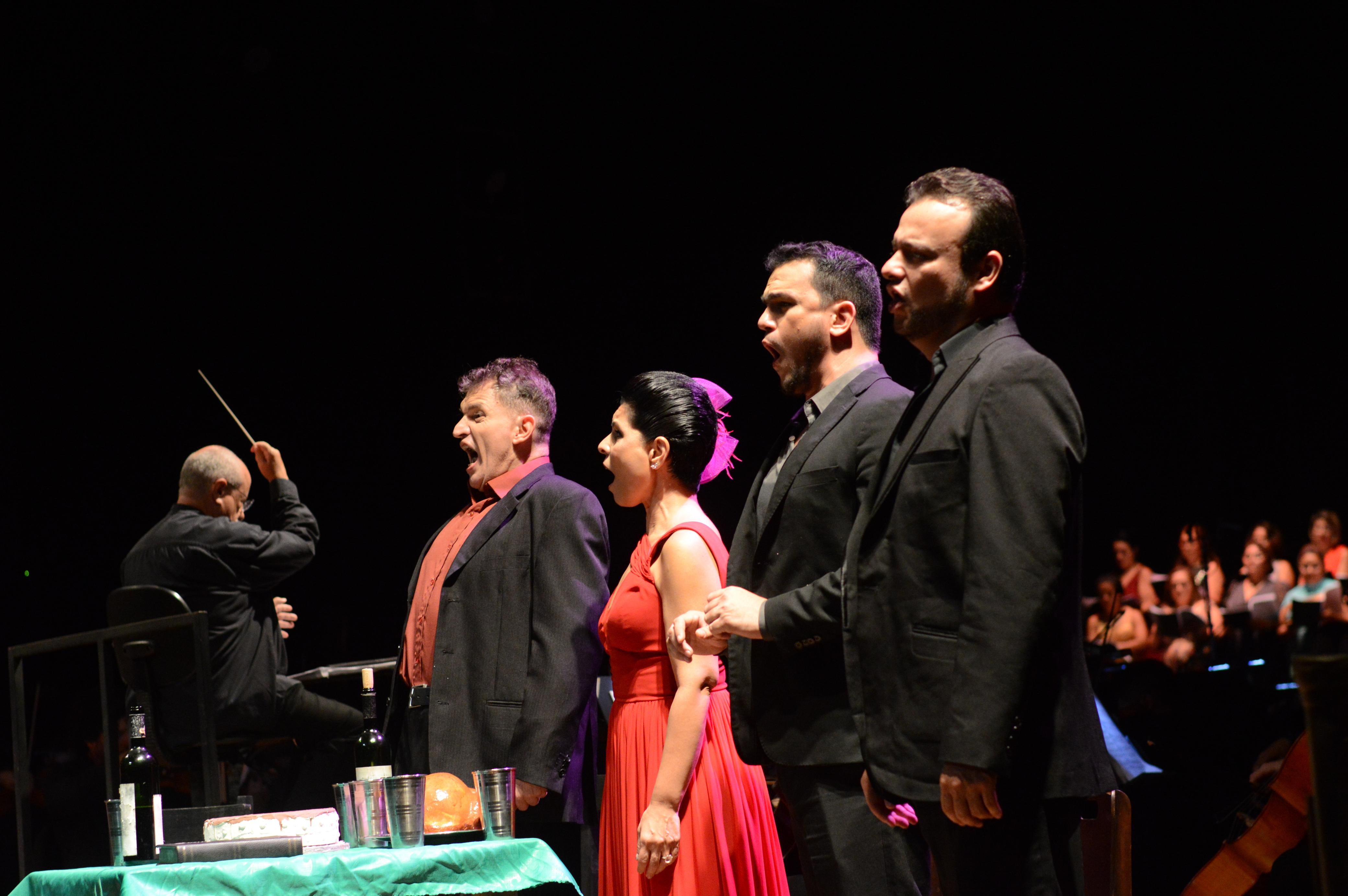 Durante a apresentação, foi feito uma encenação, uma pequena movimentação dos solistas na frente da orquestra, deixando claro para a plateia que se tratava de uma contagem em concerto.